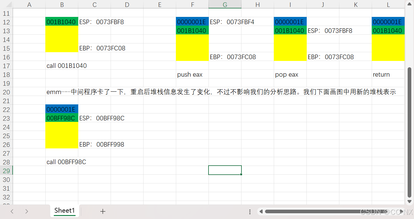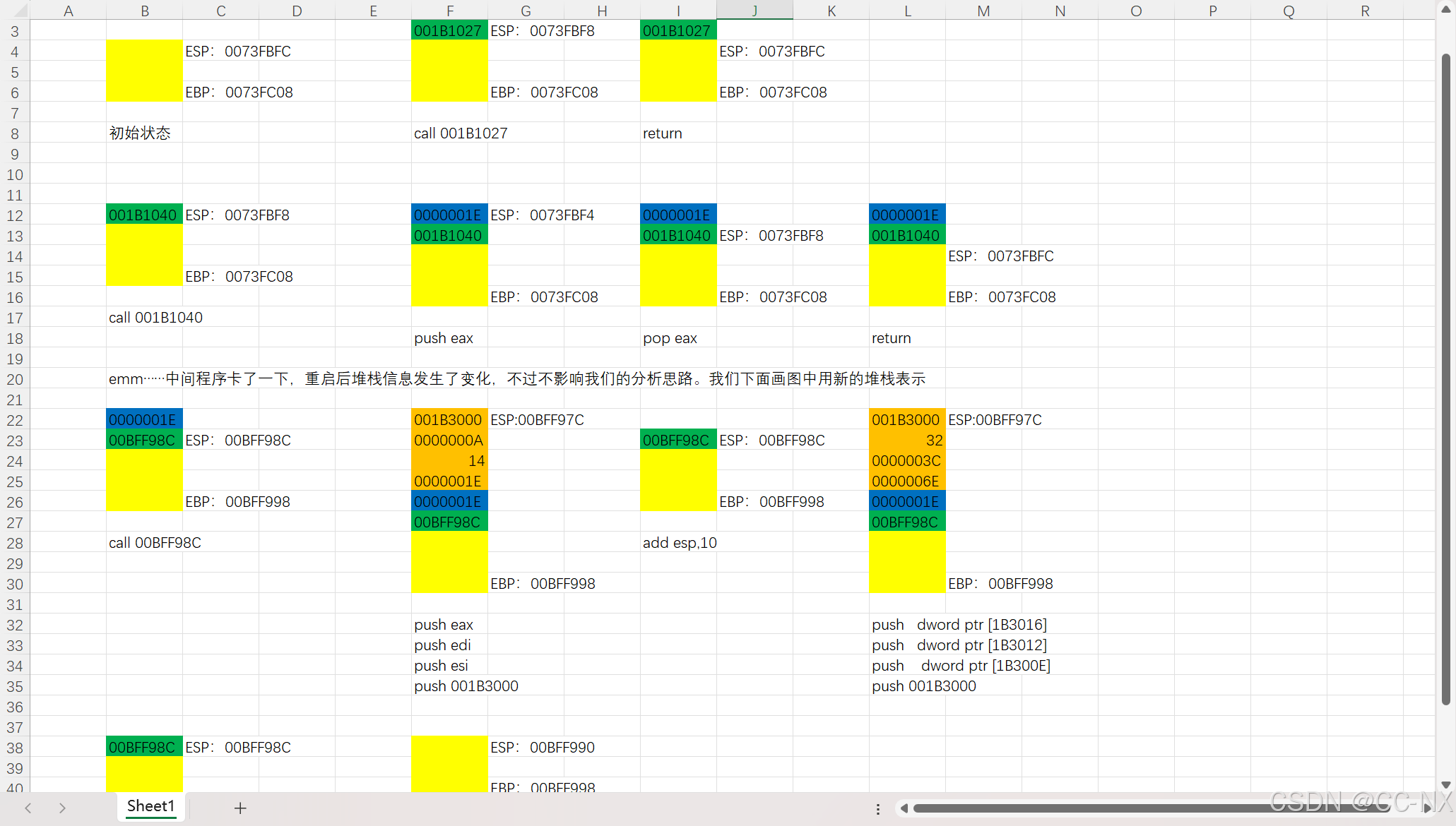 emm……中间程序卡了一下,重启后堆栈信息发生了变化,不过不影响我们的分析思路。我们下面画图中用新的堆栈表示