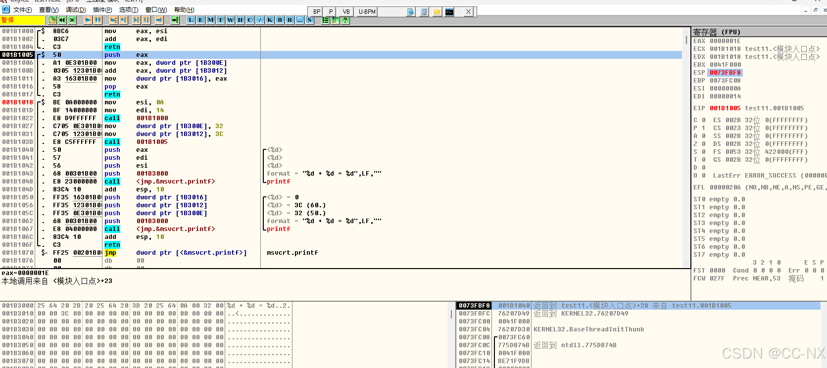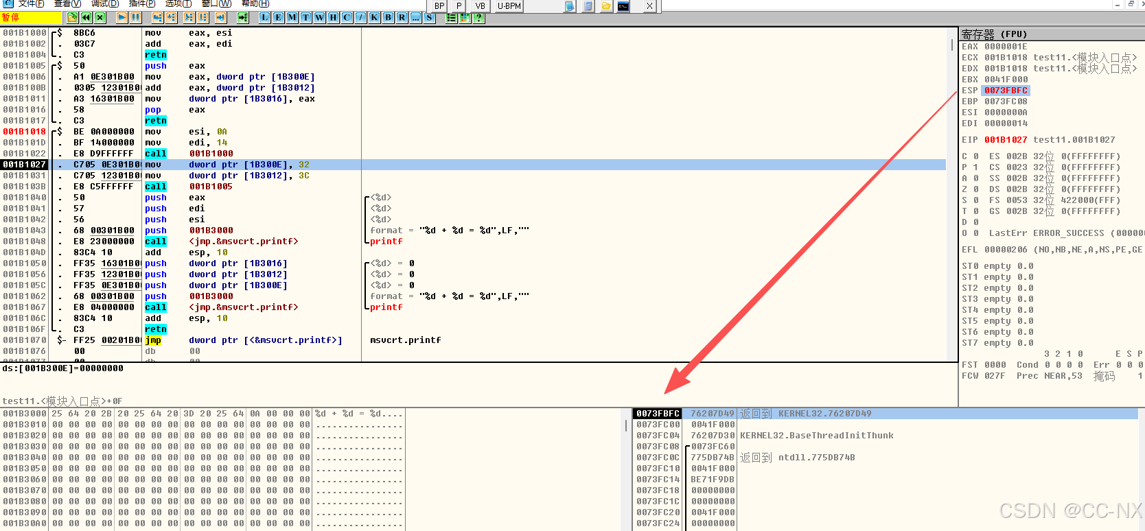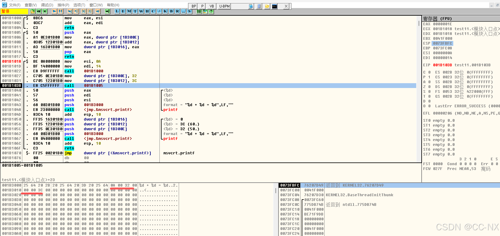初始状态下,我们先准备了参数,执行后第一次调用 call AddProc1,我们让CPU走到这里的时候停下。