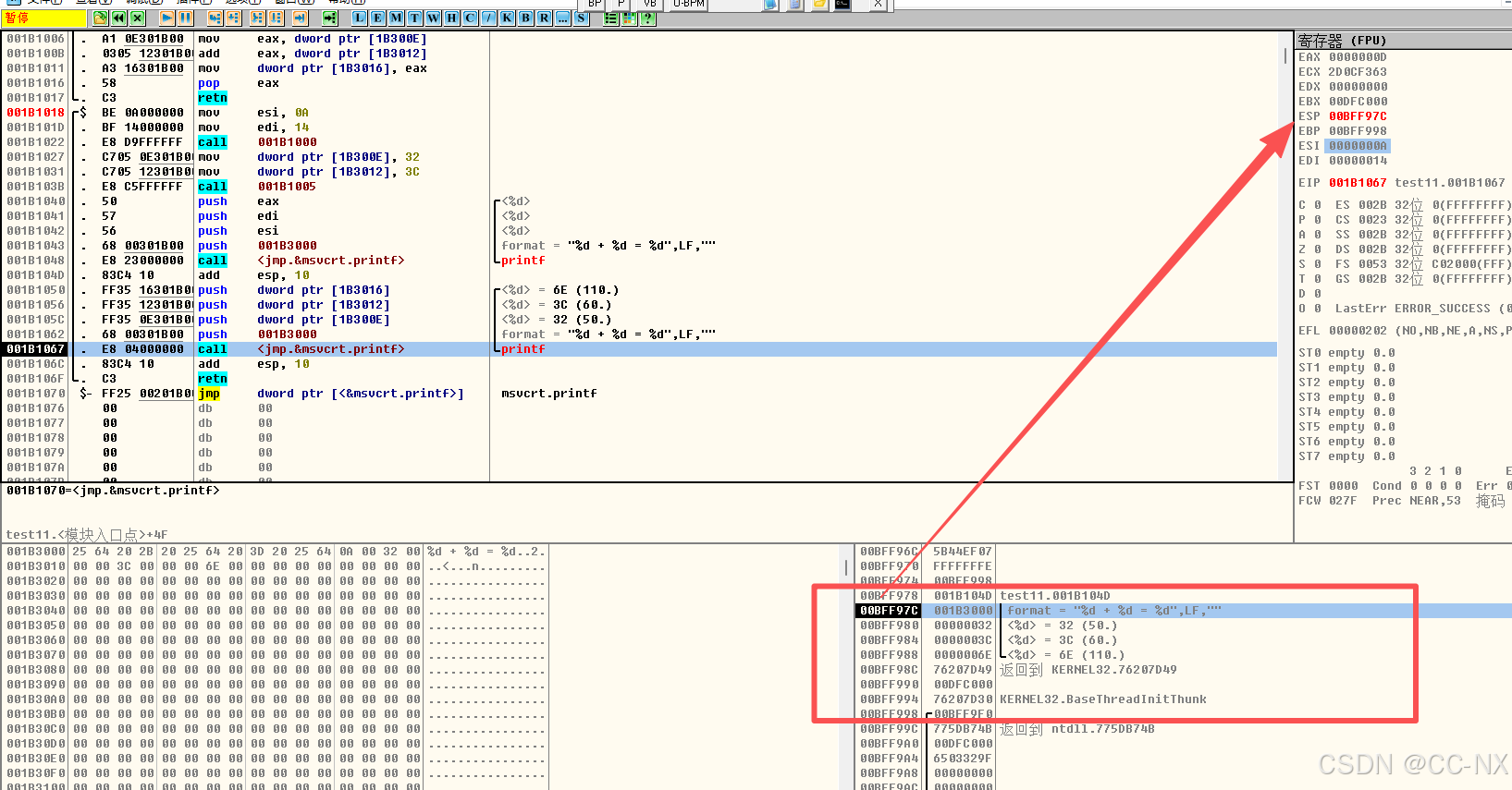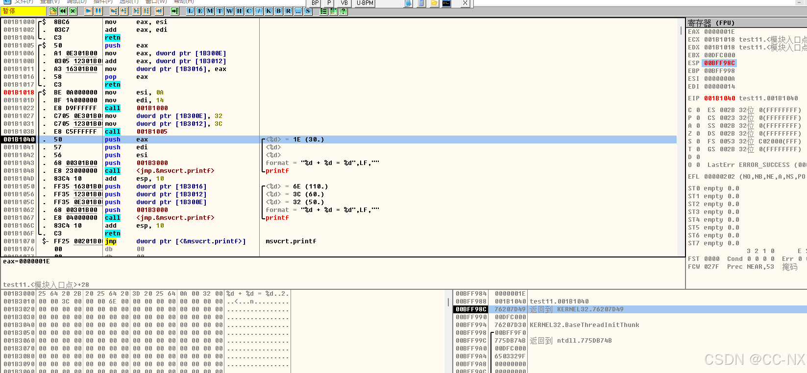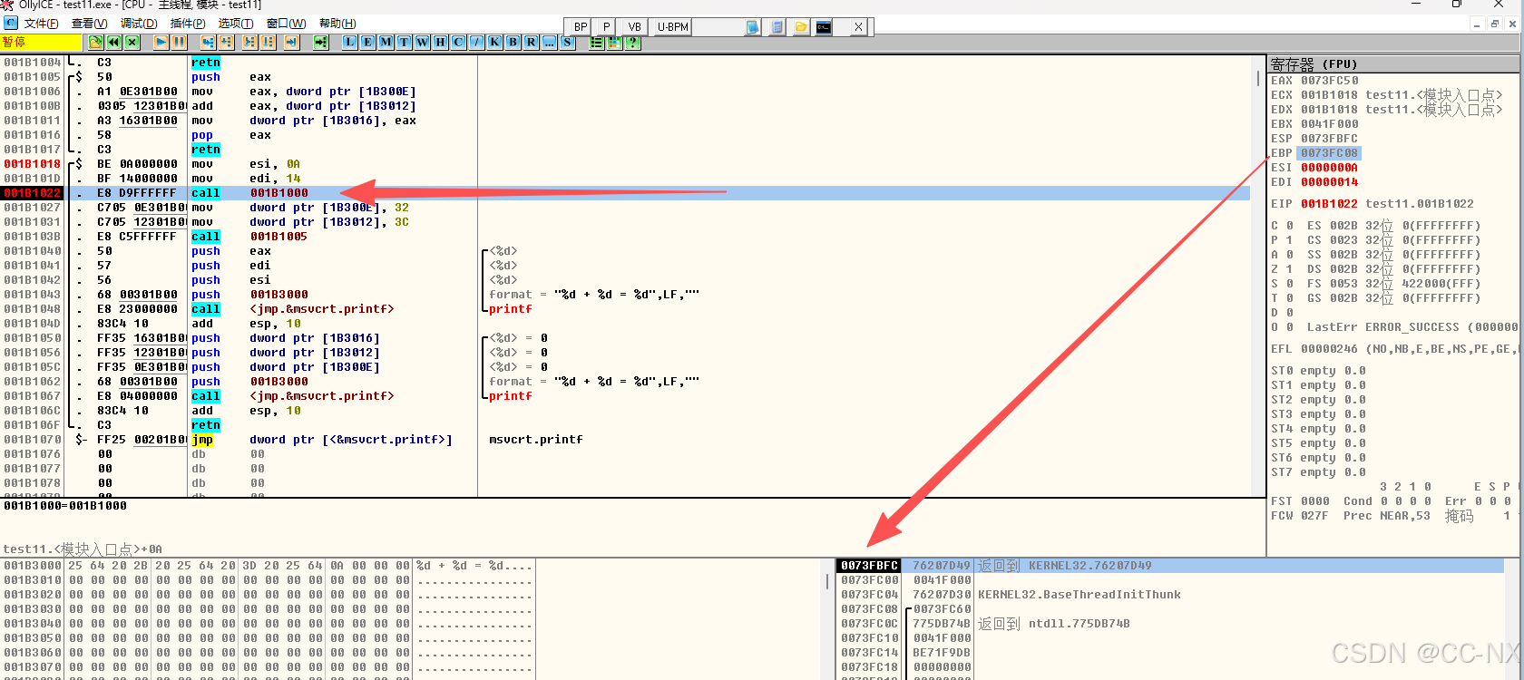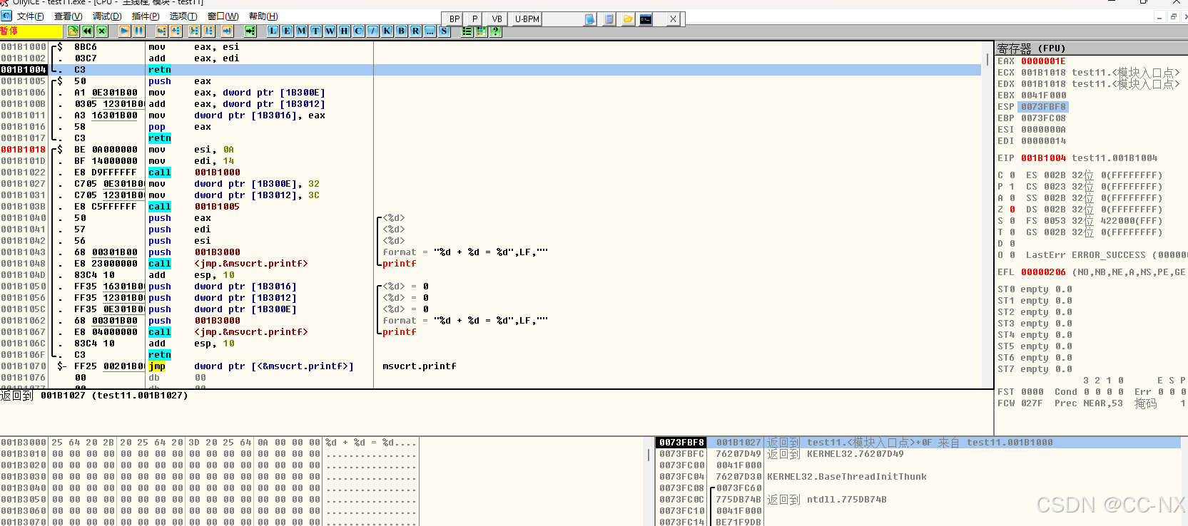 初始状态下,我们先准备了参数,执行后第一次调用 call AddProc1,我们让CPU走到这里的时候停下。
