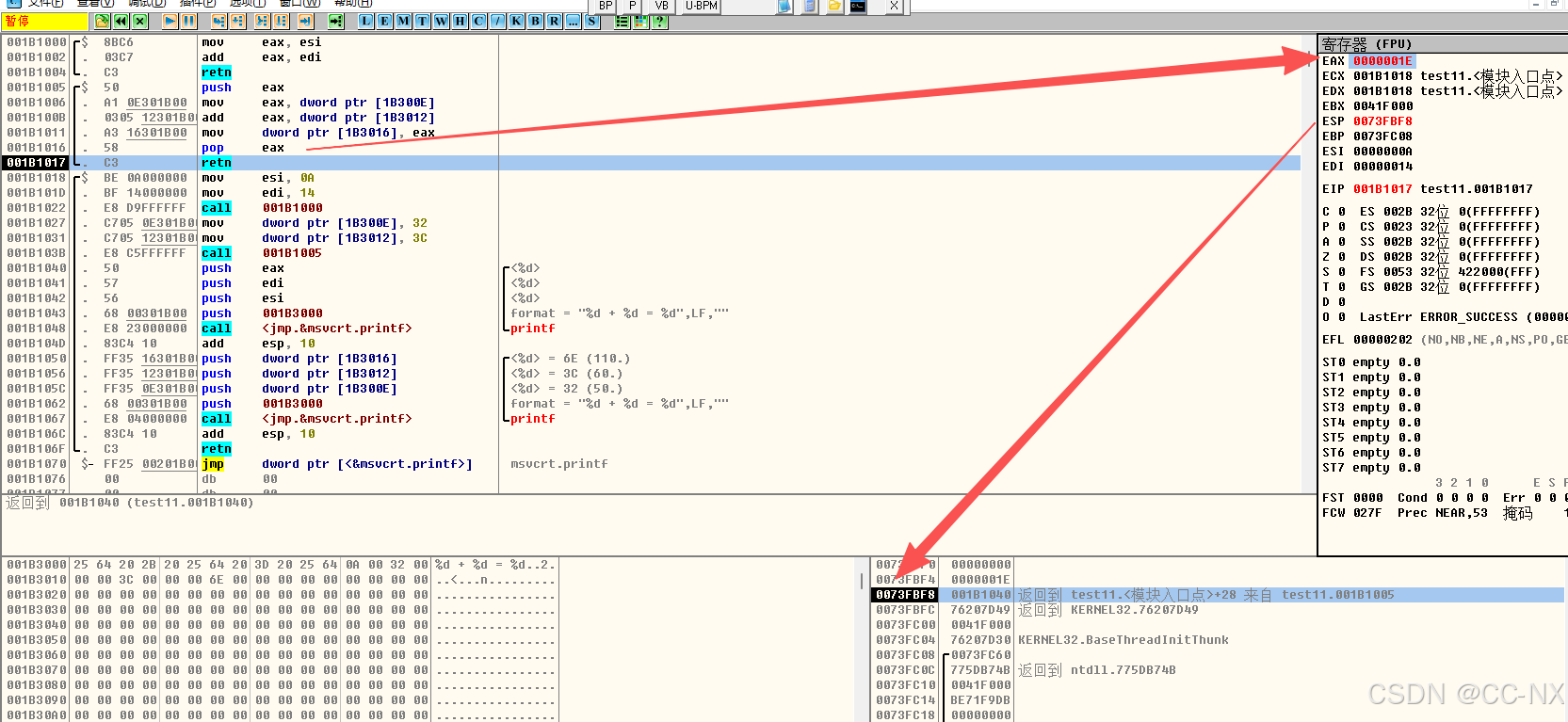 而我们知道return相当于pop EIP,从[ESP]弹出返回地址到EIP,*ESP+4*