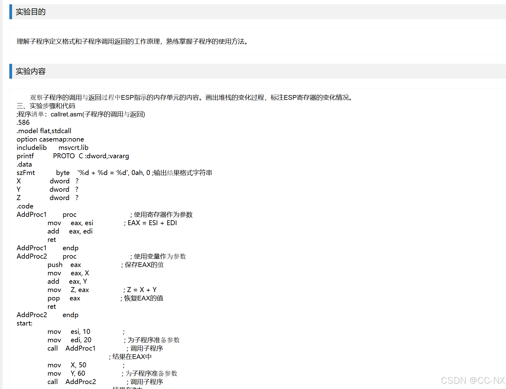 start: ; 程序入口标签 call AddProc1 ; 函数调用 ret ; 程序结束返回 end start ; 指定程序入口点