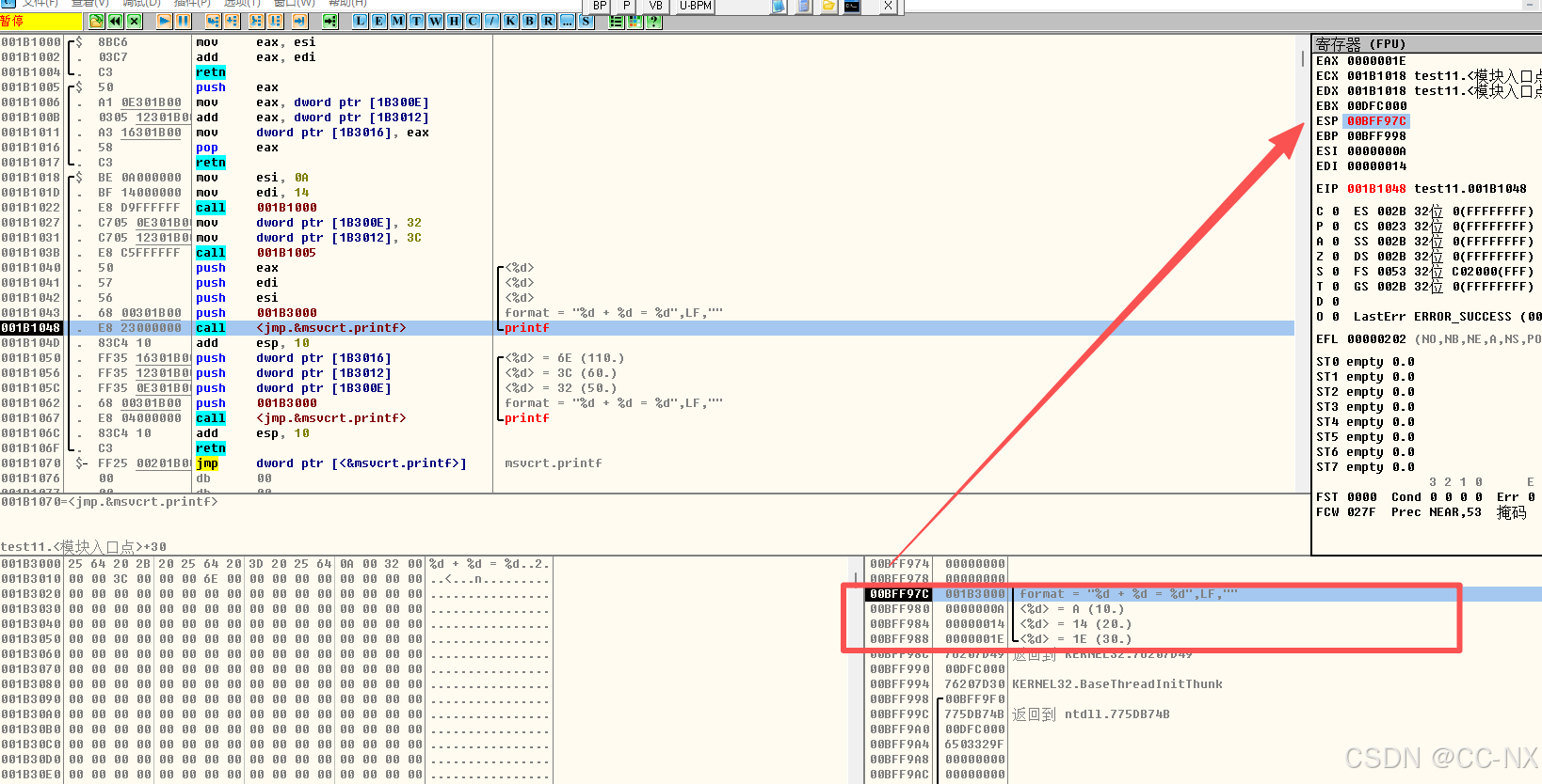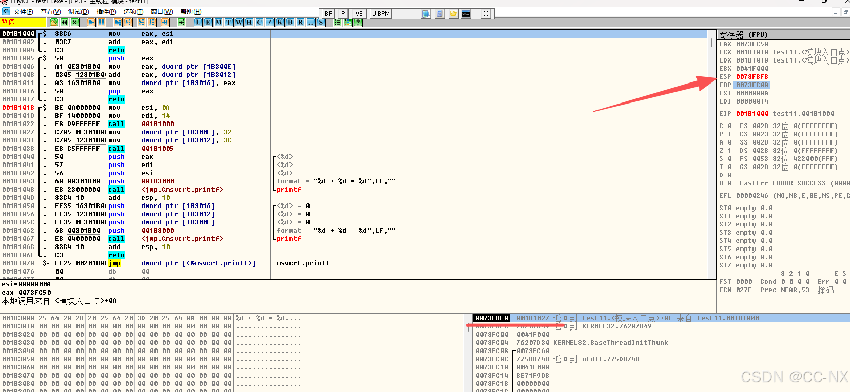 我们在OB中观察我们堆栈和ESP寄存器的变化情况