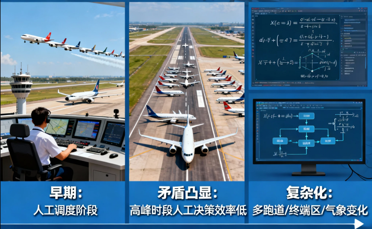 机场航班起降顺序优化的提出,源于航空运输量快速增长与机场跑道、空域容量有限之间的矛盾。早期,塔台调度员可凭经验依据安全间隔安排航班顺序,但在大型枢纽机场高峰时段,多架飞机同时等待起降的复杂场景下,人工决策速度慢且难以全局优化,导致运行效率低。进入21世纪,多跑道并行、大型终端区协同运行、气象条件变化等因素让排序问题更复杂,促使行业引入基于数学优化、启发式及智能算法的自动化排序系统,以在保证安全的前提下提高跑道利用率、减少延误、提升整体运行效率。