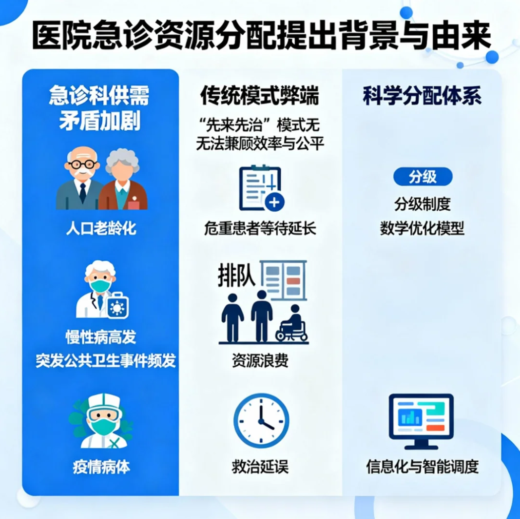 医院急诊资源分配的提出源于急诊科面临的日益严峻的供需矛盾——人口老龄化、慢性病高发以及突发公共卫生事件频发,使急诊患者数量短时间内激增,病情类型多且危急程度差异大。传统依赖人工及经验的“先来先治”模式无法同时保证效率与公平,导致危重患者等待时间延长、资源浪费和救治延误。为在保证医疗安全的前提下优化人力、设备和空间的利用,现代医院开始引入科学的急诊资源分配体系,结合分级制度、数学优化模型以及信息化与智能调度方法,实现更合理、高效的分配决策。