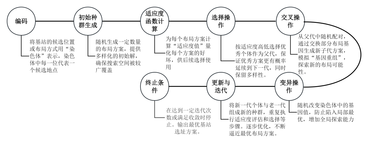 下面用一张表来简要说明,上图中遗传算法的每一步骤在通信基站布局优化中的实际含义: