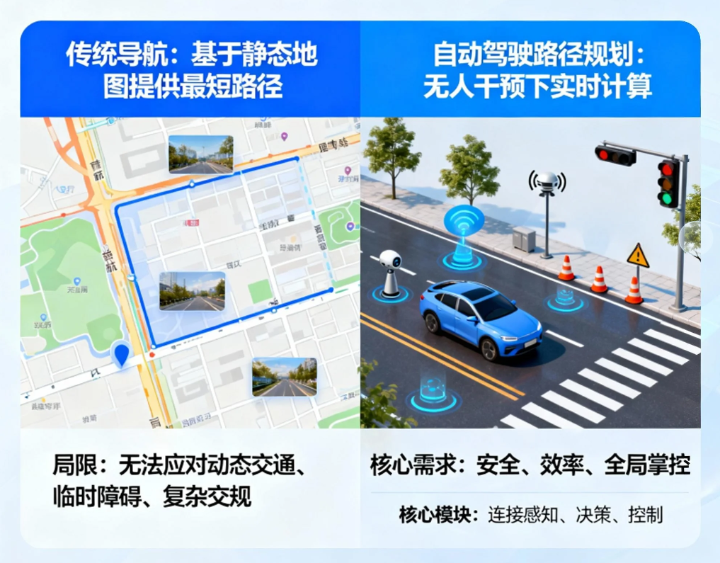 环境动态变化 | 交通流量变化、突发拥堵、天气状况变化 | 路况和可行路径随时可能改变,要求规划算法具备动态调整能力 |