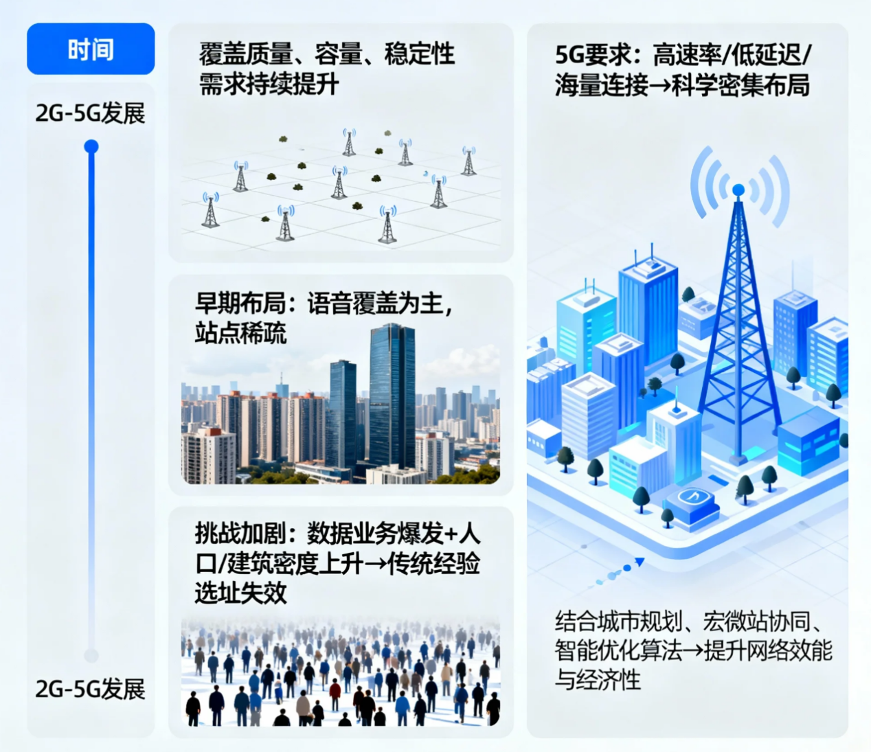通信基站布局的提出源于移动通信网络在2G到5G发展的过程中对覆盖质量、容量和稳定性需求持续提升。早期布局以满足基本语音覆盖为主,站点分布较稀疏,但随着数据业务爆发式增长和人口、建筑密度不断上升,传统依赖经验的站址选择已无法优化复杂城市或特殊地形的覆盖效果。尤其在5G时代,高速率、低延迟和海量连接的技术要求,使基站布局必须更科学、更密集地分布,并需结合城市规划、宏微站协同和智能优化算法来提升网络效能和经济性。