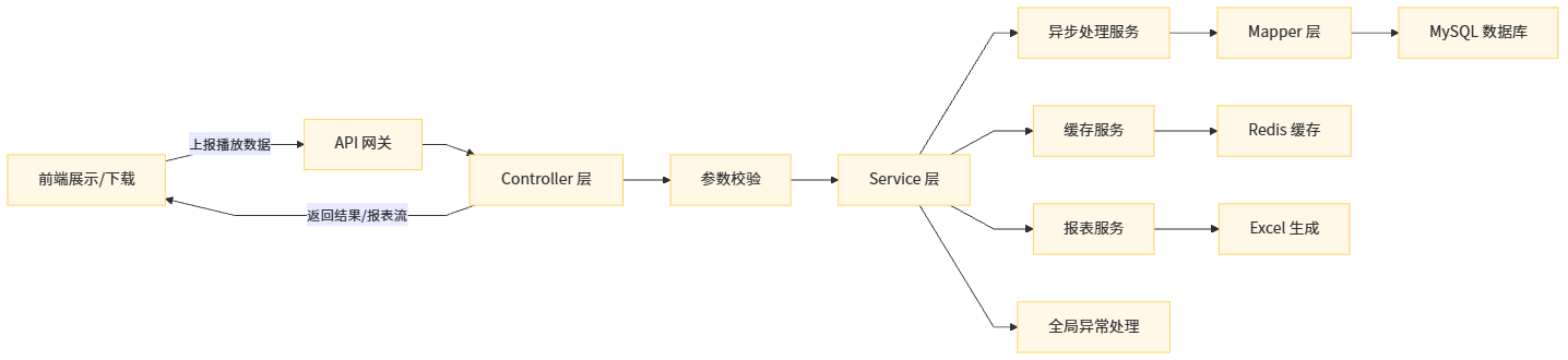 - 时长合理性校验:上报的播放时长不能超过理论时长(结束时间 - 开始时间)+30 秒(网络延迟容错),否则取理论时长。