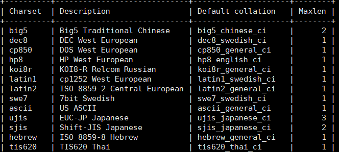 show charset;这条指令可以查看数据库支持的所有编码格式