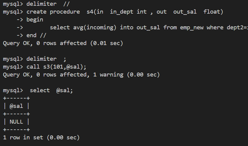 - 创建一个存储过程s4,有2个参数,传入部门号,返回该部门的平均工资