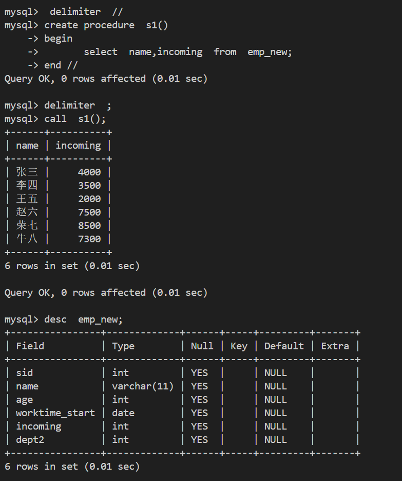- 创建提取emp_new表所有员工姓名和工资的存储过程s