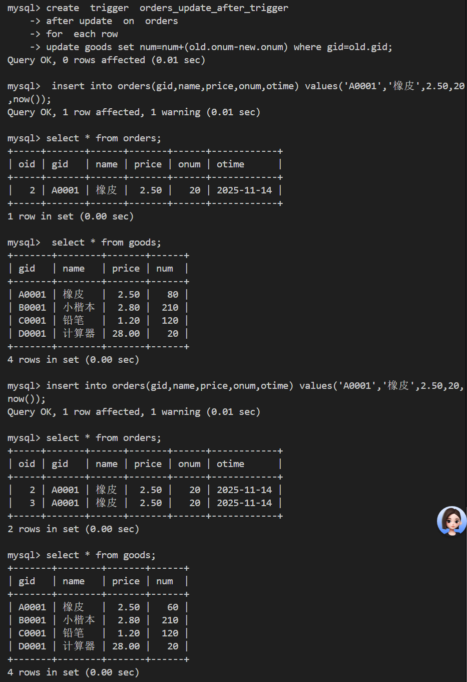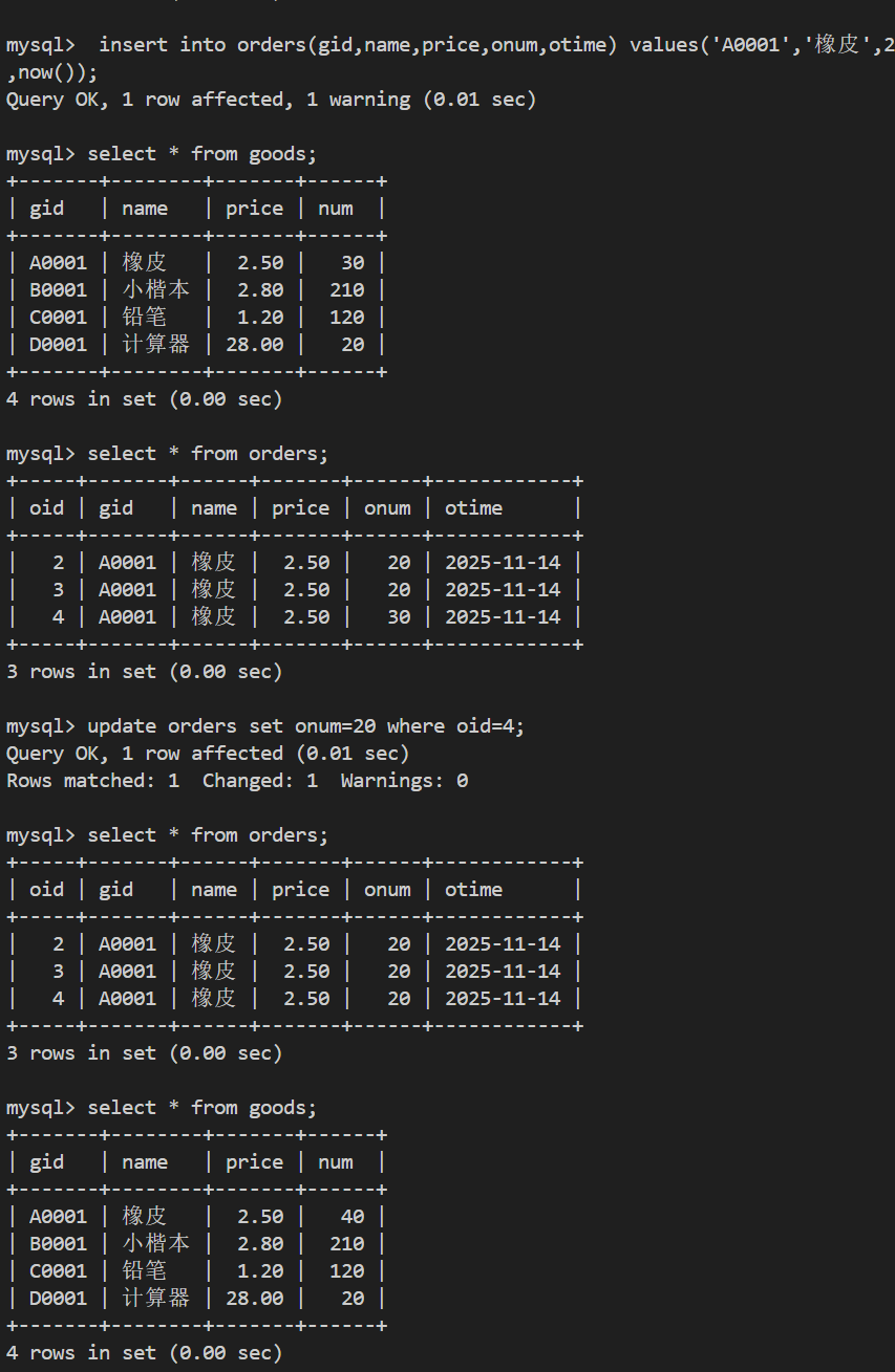 - 建立触发器,订单表中增加订单数量后,商品表商品数量同步减少对应的商品订单出数量,并测试