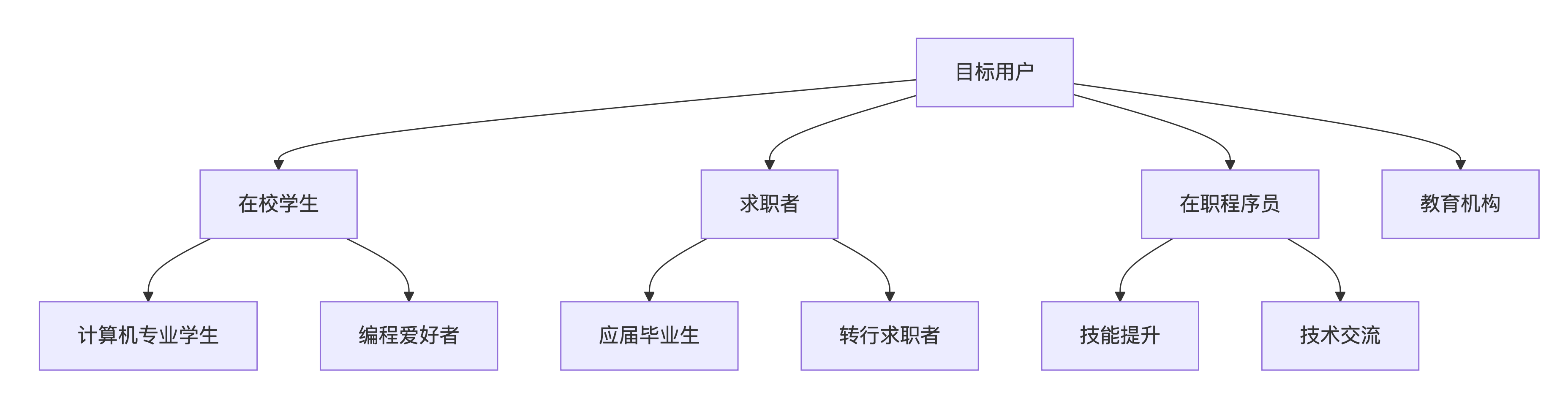 List<UserRequirement> requirements = Arrays.asList(new UserRequirement("在校学生", "课程作业", "代码运行环境配置复杂", "在线代码执行", 1),new UserRequirement求职者", "面试准备", "缺乏真实编程环境", "模拟面试题库", 2),new UserRequirement("企业HR", "人才筛选", "技术评估效率低", "自动化技术测评", 1)