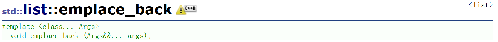 {template<class T>struct list_node{T _data;list_node<T>* _prev;list_node<T>* _next;list_node(const T& x):_data(x), _prev(nullptr), _next(nullptr){}list_node(T&& x = T()):_data(move(x)), _prev(nullptr), _next(nullptr){}template<class ...Args>list_node(Args&&... args):_data(forward<Args>(args)...), _prev(nullptr), _next(nullptr){ }};template<class T>class list{typedef list_node<T> Node;public:// ...template<class ...Args>void emplace_back(Args&&... args){emplace(end(), forward<Args>(args)...);}template<class ...Args>void emplace(iterator pos, T&& val){Node* cur = pos._node;Node* prev = cur->_prev;Node* newnode = new Node(forward<Args>(args)...);newnode->_next = cur;newnode->_prev = prev;prev->_next = newnode;cur->_prev = newnode;++_size;}private:Node* _head;size_t _size = 0;};