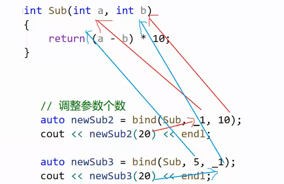 {//调整参数个数auto newSub2 = bind(Sub, _1, 10);cout << newSub2(20) << endl; //100auto newSub3 = bind(Sub, 5, _1);cout << newSub3(20) << endl; //-150return 0;