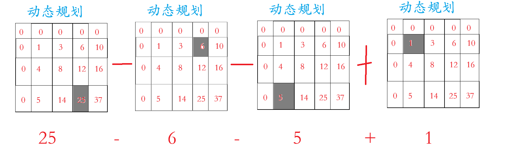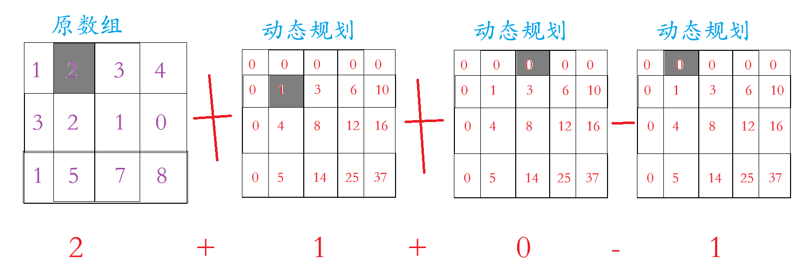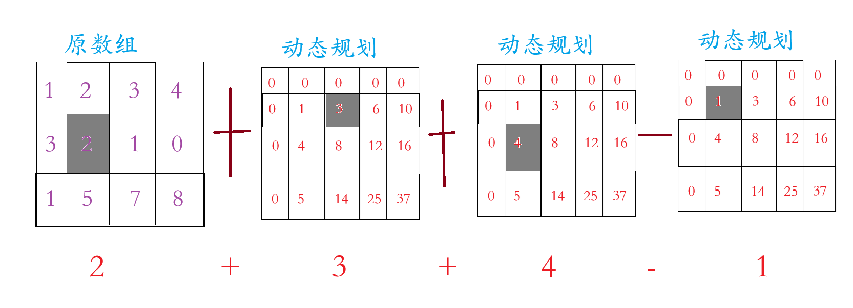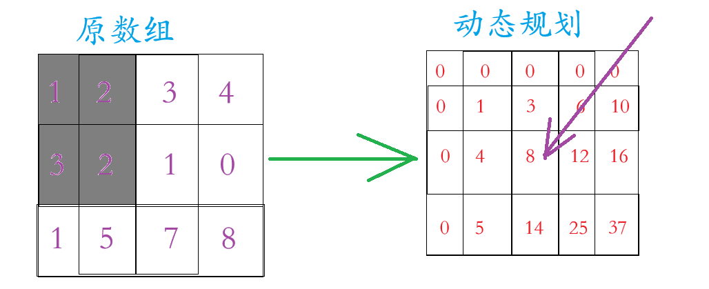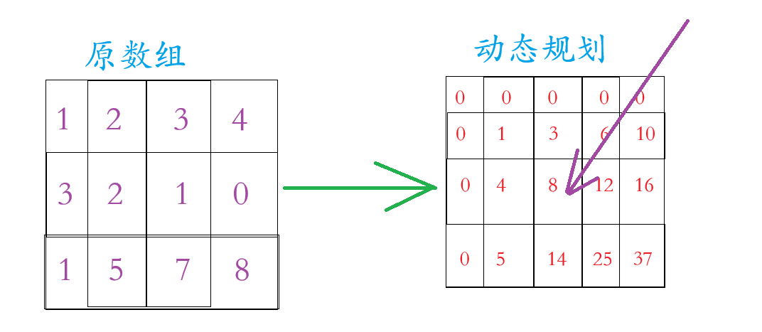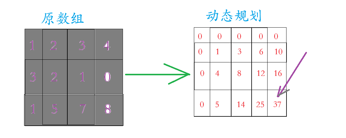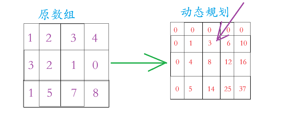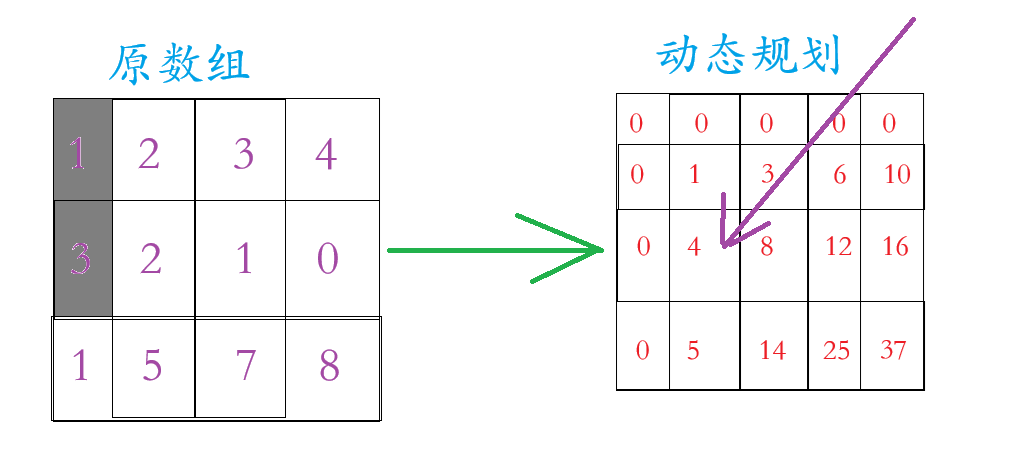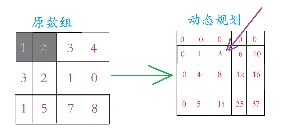 我们看上面的那张图片,动态规划的数组在原数组的基础上多加一行一列(为了边界问题),这一行一列置于0,至于动态规划里面的数字是原数组区域内的和,例如动态规划里面第2行3个数字 =