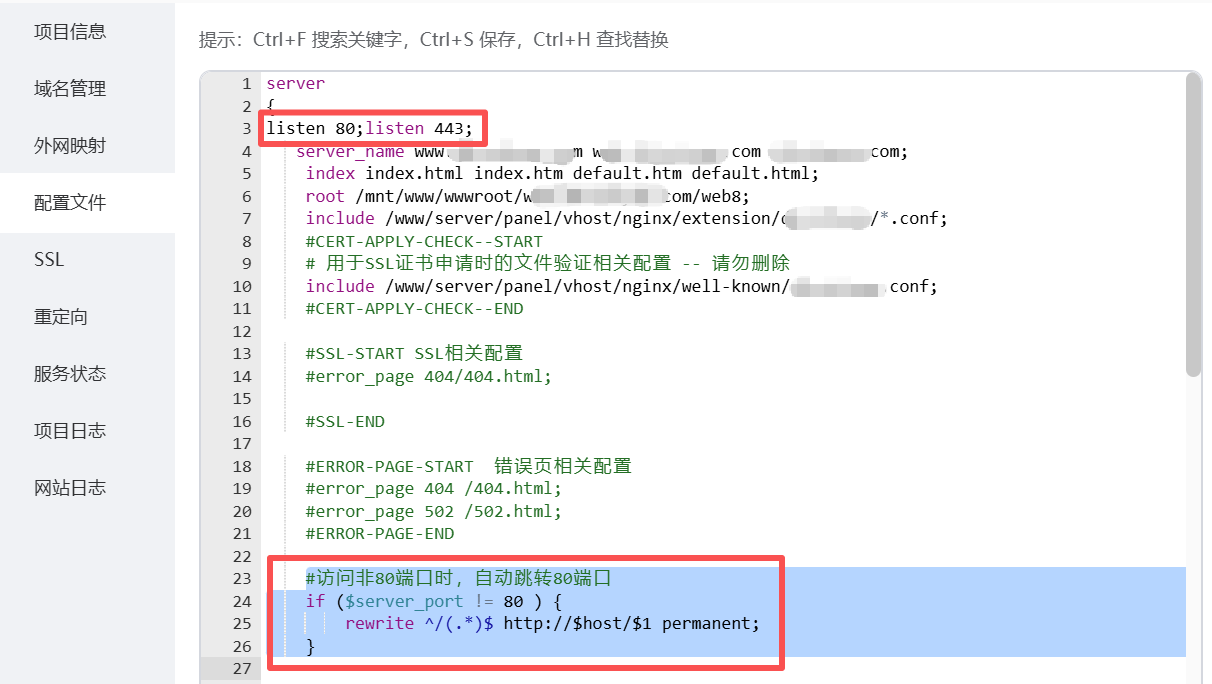 listen 80;listen 443;如果当前仅使用80端口规则,并配置下面跳转规则(使用https访问,无感跳转到http)