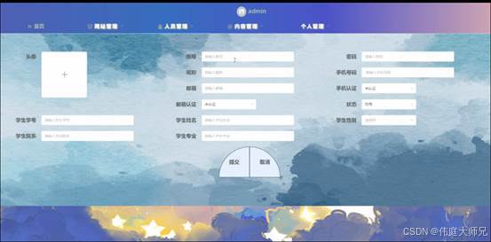 管理员在人员管理模块,可以对用户信息进行管理,人员管理模块由管理员,学生用户两部分组成,这里以学生用户管理为例,具体的实现界面如下图4.9所示: