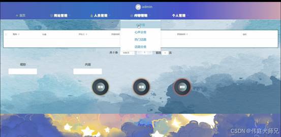 管理人员在“内容管理”这一菜单下是可以对心声墙、心声分类、热门话题、话题分类,这四个子菜单,管理员能够对这四个模块进行管控的,具体的实现界面如下图4.13所示: