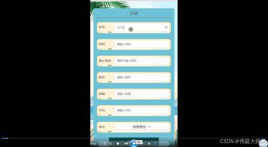 不是校园心声墙小程序中正式用户的是可以在线进行注册的,当用户点击右上角的“注册”的时候,,当填写上自己的账号+密码+确认密码+昵称+邮箱+手机号+选择身份登信息后,后再点击“注册”按钮后将会先验证输入的有没有空数据,再次验证密码和确认密码是否是一样的,最后验证输入的账户名和数据库表中已经注册的账户名是否重复,只有都验证没问题后即可注册成功。用户注册界面展示如下图4.2所示。