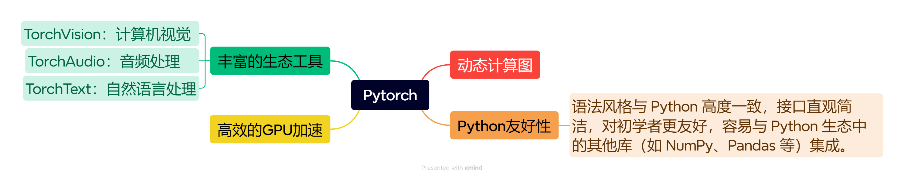 PyTorch 是一个开源的深度学习框架,主要用于构建和训练机器学习(尤其是深度学习)模型,由 Meta(原 Facebook)的人工智能研究实验室(FAIR)开发并维护。它以灵活性、易用性和强大的功能被广泛应用于学术研究和工业界。其核心特点如下图所示: