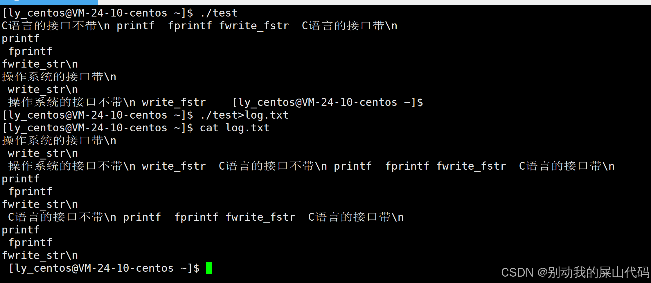 第二块标准 IO 代码(“C 语言的接口带” 部分):printf("printf\n"); 包含\n,触发行缓冲刷新,此时会将第一块的缓冲内容 + 第二块的printf\n 一起输出,形成 “C语言的接口不带\n printf fprintf fwrite_fstr C语言的接口带\nprintf” 的连续内容。