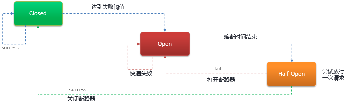 如果检测到10秒内请求的失败率超过50%,就会触发熔断机制。之后每隔5s重新尝试请求微服务,如果微服务不能相应,继续走熔断机制。如果微服务可达,则关闭熔断机制,恢复正常请求。