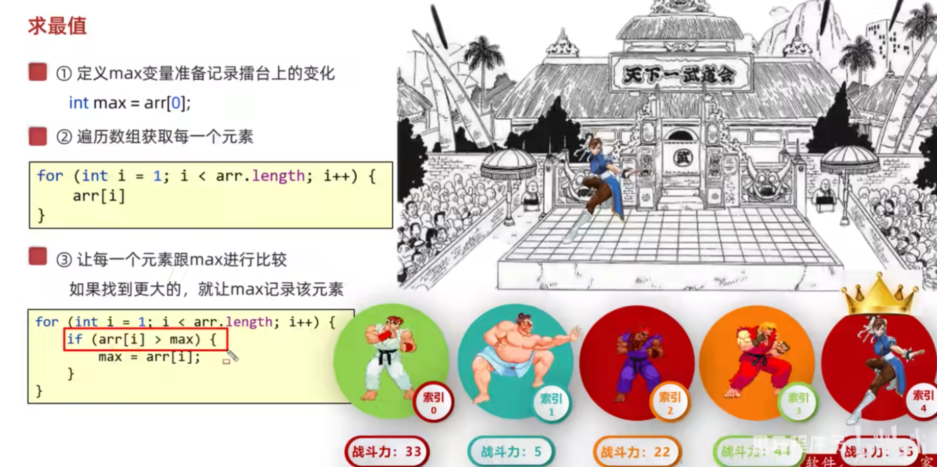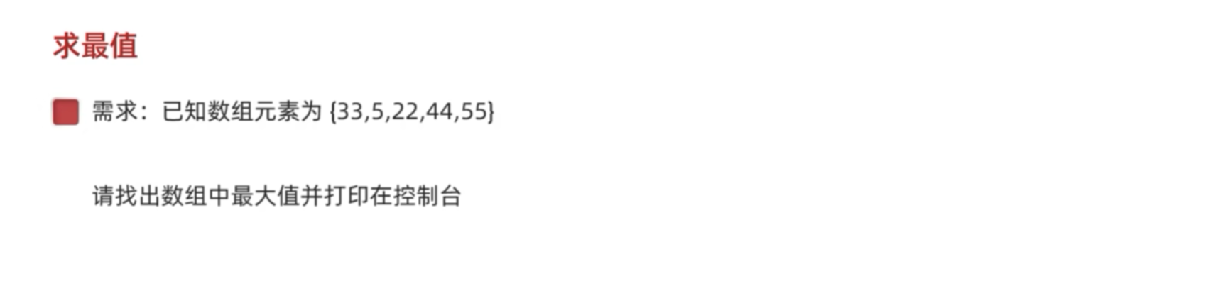 public class Test1 {public static void main(String[] args) {int[] arr = {33,5,22,44,55};int max = arr[0];for (int i = 0; i < arr.length; i++) {if (max < arr[i]){max = arr[i];}}System.out.println(max);}