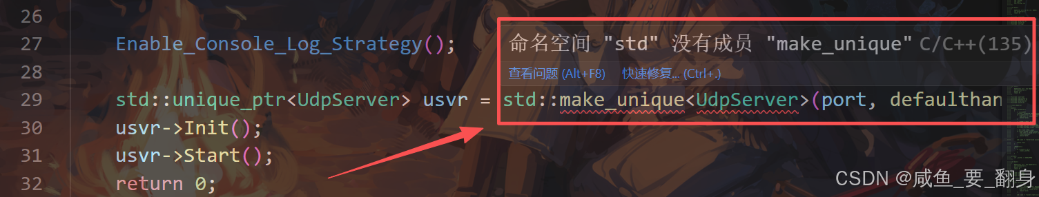 这段代码实现了一个基于UDP协议的服务器类UdpServer,下面我将从各个方面进行详细讲解。