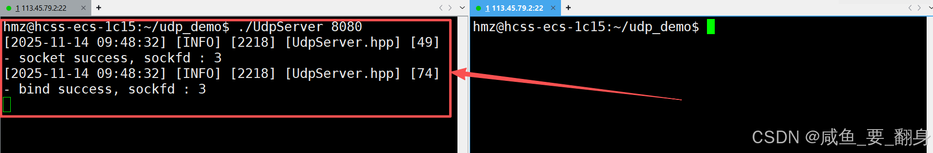 public:// 构造函数// @param port: 服务器监听的端口号// @param func: 数据处理回调函数UdpServer(uint16_t port, func_t func): _sockfd(defaultfd),_port(port),_isrunning(false),_func(func){}// 初始化服务器,创建socket并绑定端口void Init(){// 1. 创建UDP套接字// AF_INET: IPv4地址族// SOCK_DGRAM: 数据报套接字(UDP)// 0: 让系统自动选择协议(对于UDP是IPPROTO_UDP)_sockfd = socket(AF_INET, SOCK_DGRAM, 0);if (_sockfd < 0){LOG(LogLevel::FATAL) << "socket error!";exit(1);}LOG(LogLevel::INFO) << "socket success, sockfd : " << _sockfd;// 2. 绑定socket到指定端口struct sockaddr_in local;// 清零结构体,避免未初始化数据bzero(&local, sizeof(local));// 设置地址族为IPv4local.sin_family = AF_INET;// 将端口号从主机字节序转换为网络字节序(大端)local.sin_port = htons(_port);// INADDR_ANY表示绑定到所有本地接口// 服务器通常这样设置以接收所有网络接口的数据local.sin_addr.s_addr = INADDR_ANY;// 绑定socket到指定的地址和端口// 对于服务器必须显式绑定,因为需要固定监听端口int n = bind(_sockfd, (struct sockaddr *)&local, sizeof(local));if (n < 0){LOG(LogLevel::FATAL) << "bind error";exit(2);}LOG(LogLevel::INFO) << "bind success, sockfd : " << _sockfd;}// 启动服务器,进入主事件循环void Start(){_isrunning = true;while (_isrunning){char buffer[1024]; // 接收缓冲区struct sockaddr_in peer; // 存储对端地址信息socklen_t len = sizeof(peer); // 地址结构体长度// 1. 接收客户端消息// recvfrom是阻塞调用,直到收到数据或出错ssize_t s = recvfrom(_sockfd, buffer, sizeof(buffer) - 1, 0, (struct sockaddr *)&peer, &len);if (s > 0){// 处理接收到的数据buffer[s] = '\0'; // 确保字符串正确终止// 获取客户端信息int peer_port = ntohs(peer.sin_port); // 网络字节序转主机字节序std::string peer_ip = inet_ntoa(peer.sin_addr); // 网络字节序IP转点分十进制// 调用回调函数处理数据std::string result = _func(buffer);// 2. 发送响应消息回客户端sendto(_sockfd, result.c_str(), result.size(), 0, (struct sockaddr*)&peer, len);}}}// 析构函数~UdpServer(){// 注意:实际应该在这里关闭socket,但代码中遗漏了// 应该在_sockfd != defaultfd时调用close(_sockfd)}private:int _sockfd; // 服务器socket文件描述符uint16_t _port; // 服务器监听端口bool _isrunning; // 服务器运行状态标志func_t _func; // 数据处理回调函数