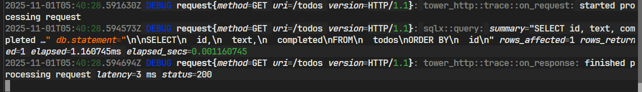 在终端中运行cargo run。由于我们在main.rs的日志配置中添加了sqlx=debug,现在你的终端会变得非常“热闹”。你会看到sqlx打印出大量有用的调试信息,包括它如何从连接池中获取连接、执行的每一条具体的 SQL 语句以及执行耗时。这对于理解应用底层行为和性能调试非常有帮助。