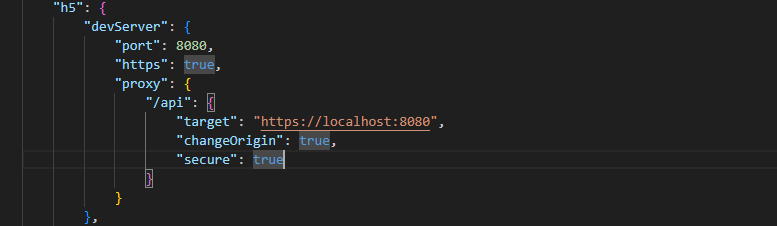 "devServer": {"port": 8080,"https": true,"proxy": {"/api": {"target": "https://localhost:8080","changeOrigin": true,"secure": true}}},