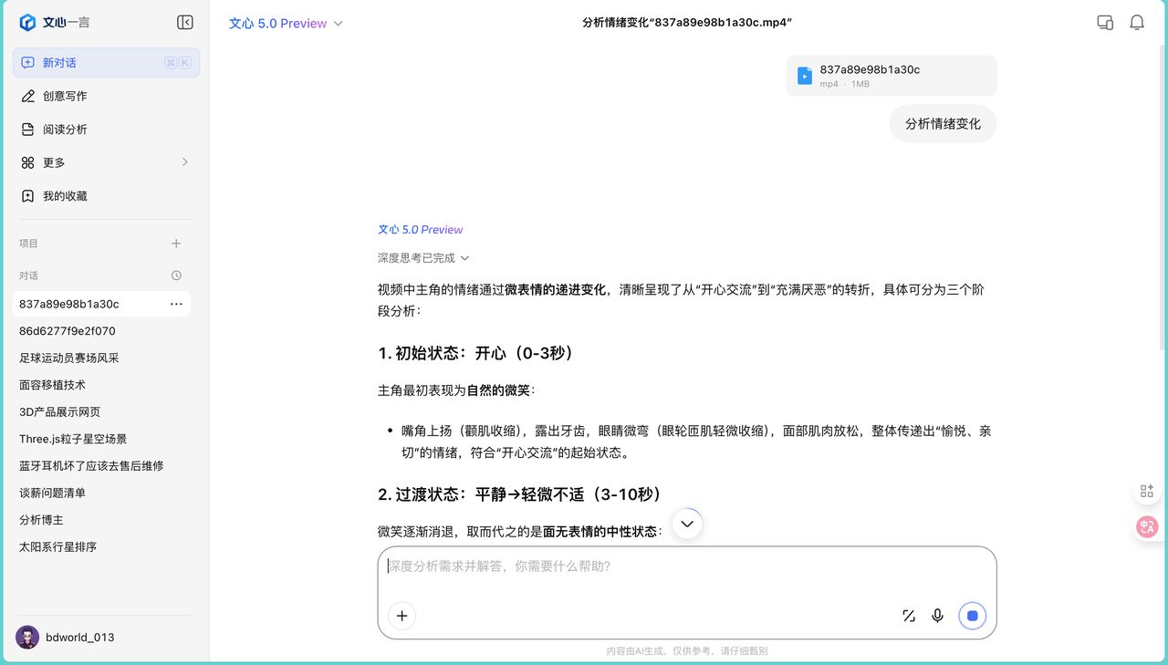 在情绪识别测试中,我上传了一段面部表情变化的视频,让它分析情绪变化过程: