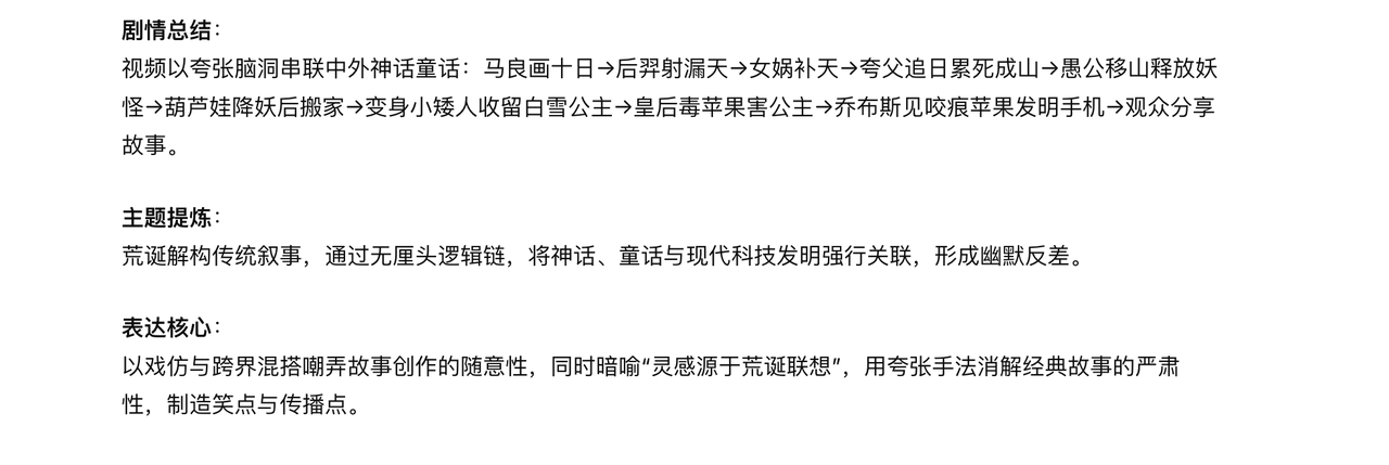 我专门找了一段剧情复杂且充满荒诞逻辑的短片来测试,从马良画十日到后羿射日,从女娲补天到夸父追日,再到愚公移山、葫芦娃降妖,最后竟然扯到白雪公主和乔布斯发明iPhone,整个故事线跳跃且充满脑洞。