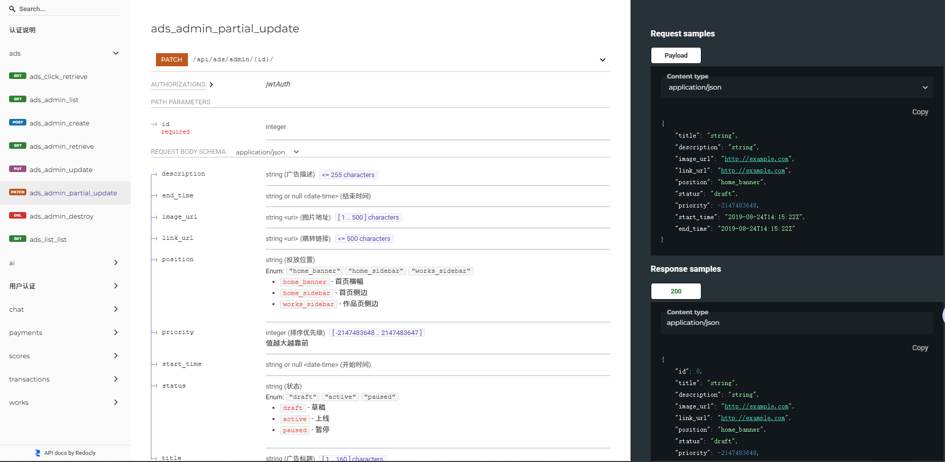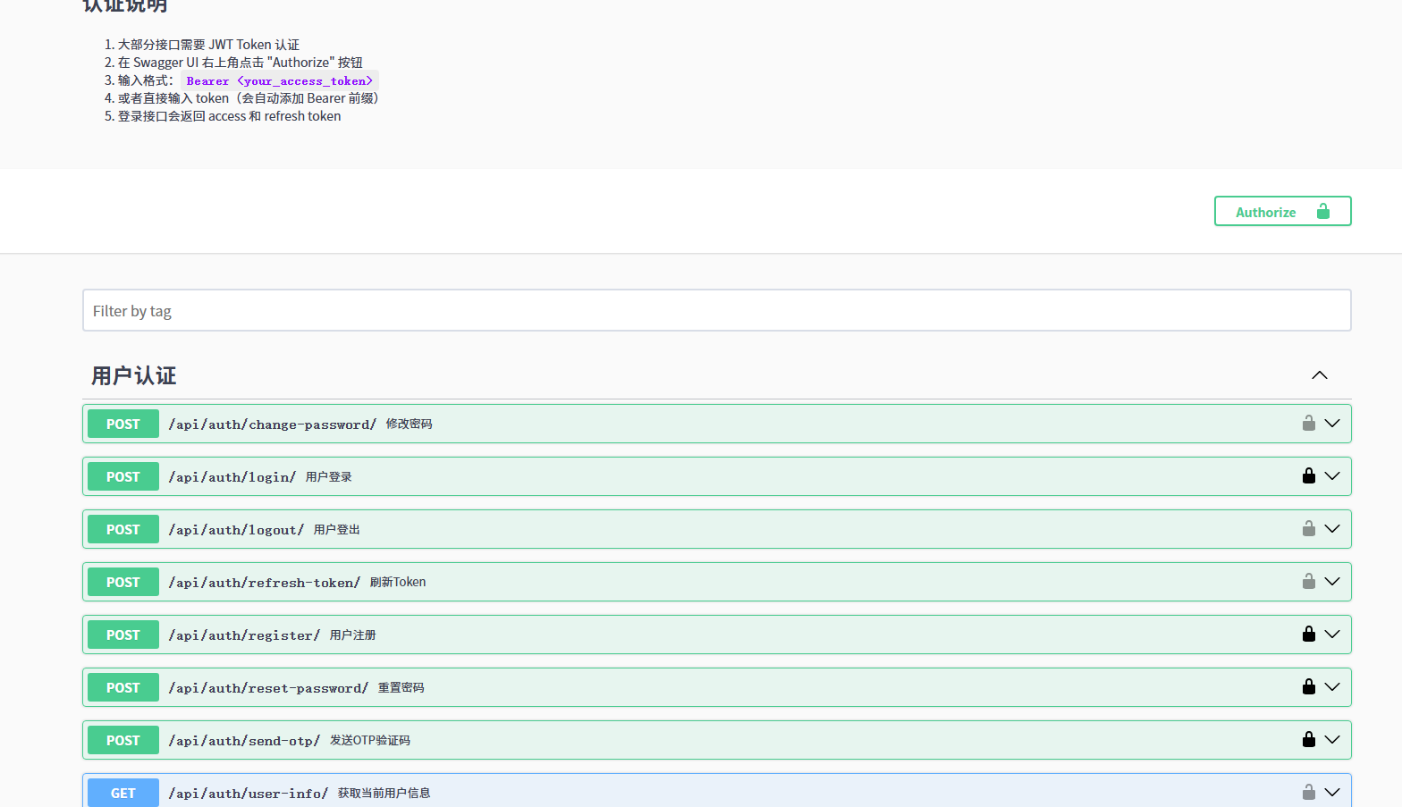 )urlpatterns = [path('admin/', admin.site.urls),path('api/', include('api.urls')),# Swagger UI 文档re_path(r'^swagger/$', schema_view.with_ui('swagger', cache_timeout=0), name='swagger-ui'),# ReDoc 文档re_path(r'^redoc/$', schema_view.with_ui('redoc', cache_timeout=0), name='redoc'),