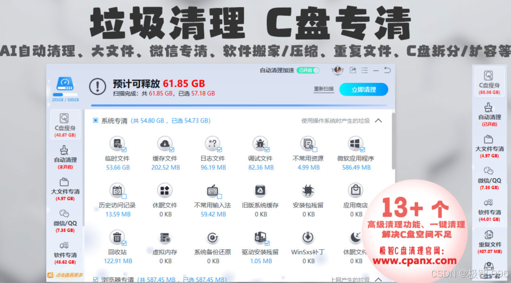 4、启动后清理垃圾,避免二次启动失败:修复后系统可能存在系统缓存垃圾文件残留,再次影响开机启动,可以点击以下或者文章尾部的官网链接卡片,前往其官网并使用极智C盘清理软件的系统垃圾清理功能来清理缓存垃圾文件,保持系统干净清爽,远离系统异常。