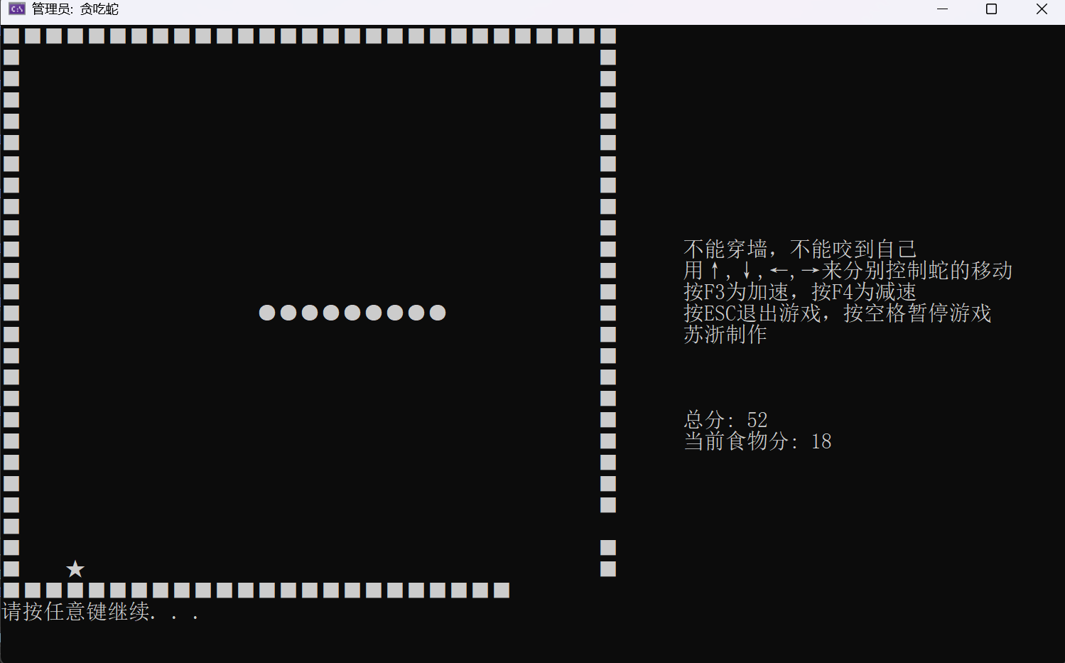 {SetPos(64, 10);wprintf(L"%ls", L"不能穿墙,不能咬到自己");SetPos(64, 11);wprintf(L"%ls", L"用↑,↓,←,→来分别控制蛇的移动");SetPos(64, 12);wprintf(L"%ls", L"按F3为加速,按F4为减速");SetPos(64, 13);wprintf(L"%ls", L"按ESC退出游戏,按空格暂停游戏");SetPos(64, 14);wprintf(L"%ls", L"苏浙制作");