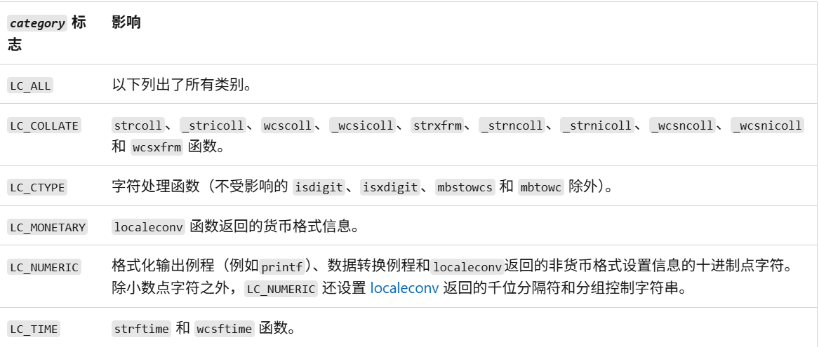 如果说我们想要改变类项的话,就要借助setlocale函数,其函数声明如下:
