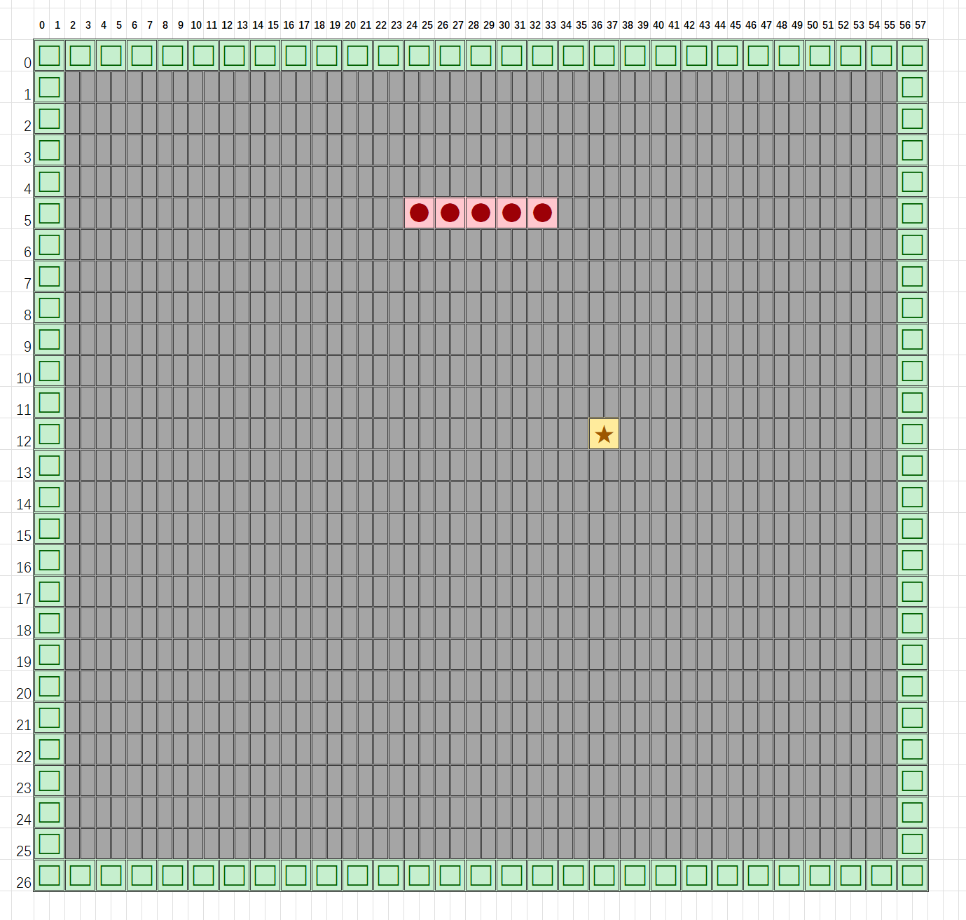 我们假设实现一个27行,58列的棋盘,再围绕地图画出墙如下:
