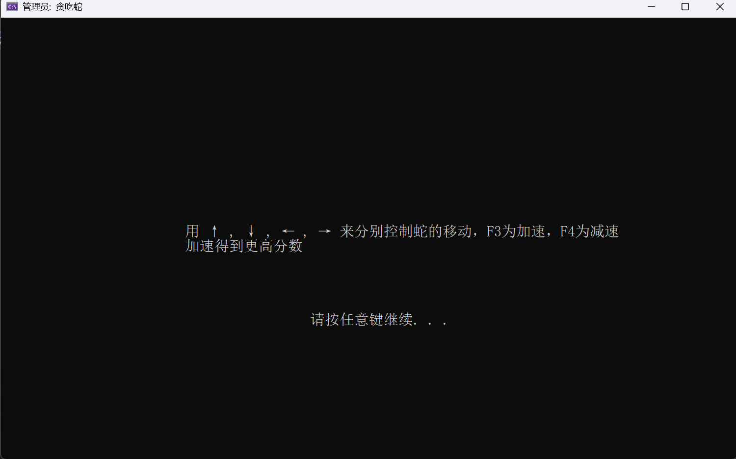 {SetPos(40, 14);wprintf(L"欢迎来到贪吃蛇小游戏!");SetPos(42, 20);system("pause");system("cls");SetPos(25, 14);wprintf(L"⽤ ↑ . ↓ . ← . → 分别控制蛇的移动, F3为加速,F4为减速\n");SetPos(25, 15);wprintf(L"加速得到更高分数");SetPos(42, 20);system("pause");system("cls");