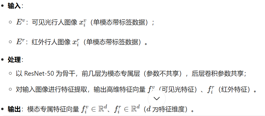通过多损失联合优化,输出更具跨模态一致性的特征编码器 \(E^v, E^r\),使得同一行人的可见光特征和红外特征在语义空间中更接近。