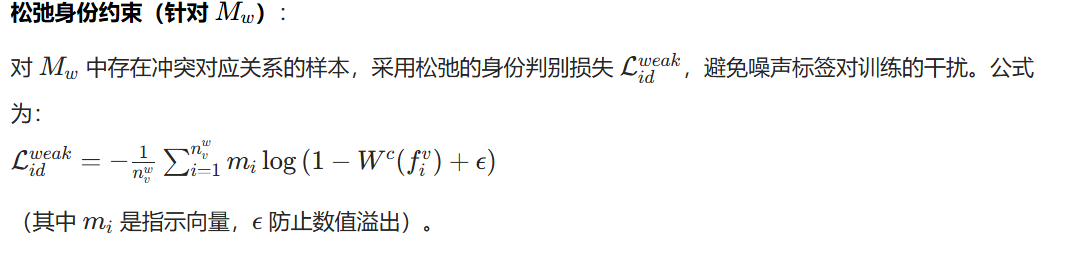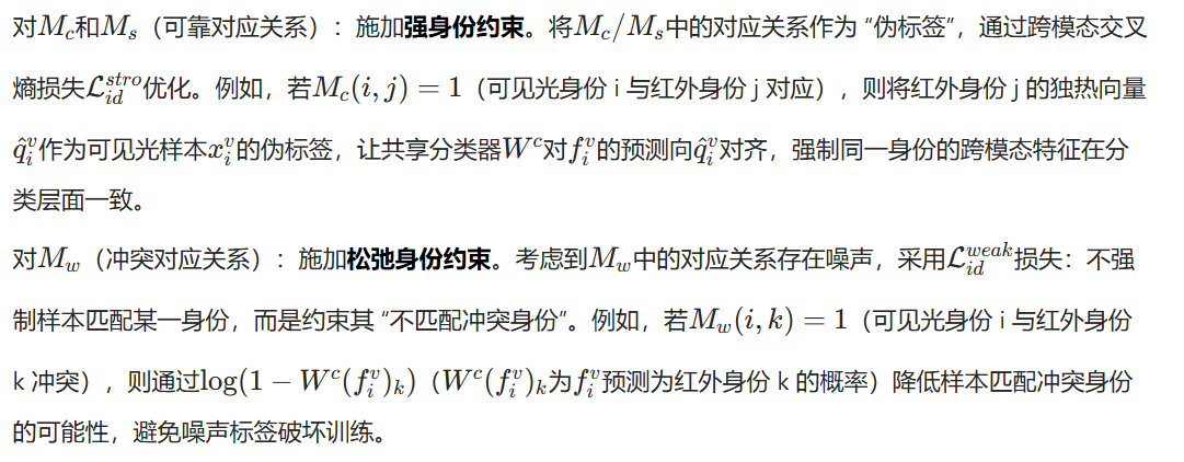 - 额外任务:练完 “专才” 后,还要让它们试着 “跨模态猜身份”—— 比如让懂红外的 W^r,看 E^v 提的可见光特征,猜 “这个可见光样本对应红外里的哪个身份”;让懂可见光的 W^v,看 E^r 提的红外特征,猜 “这个红外样本对应可见光里的哪个身份”。