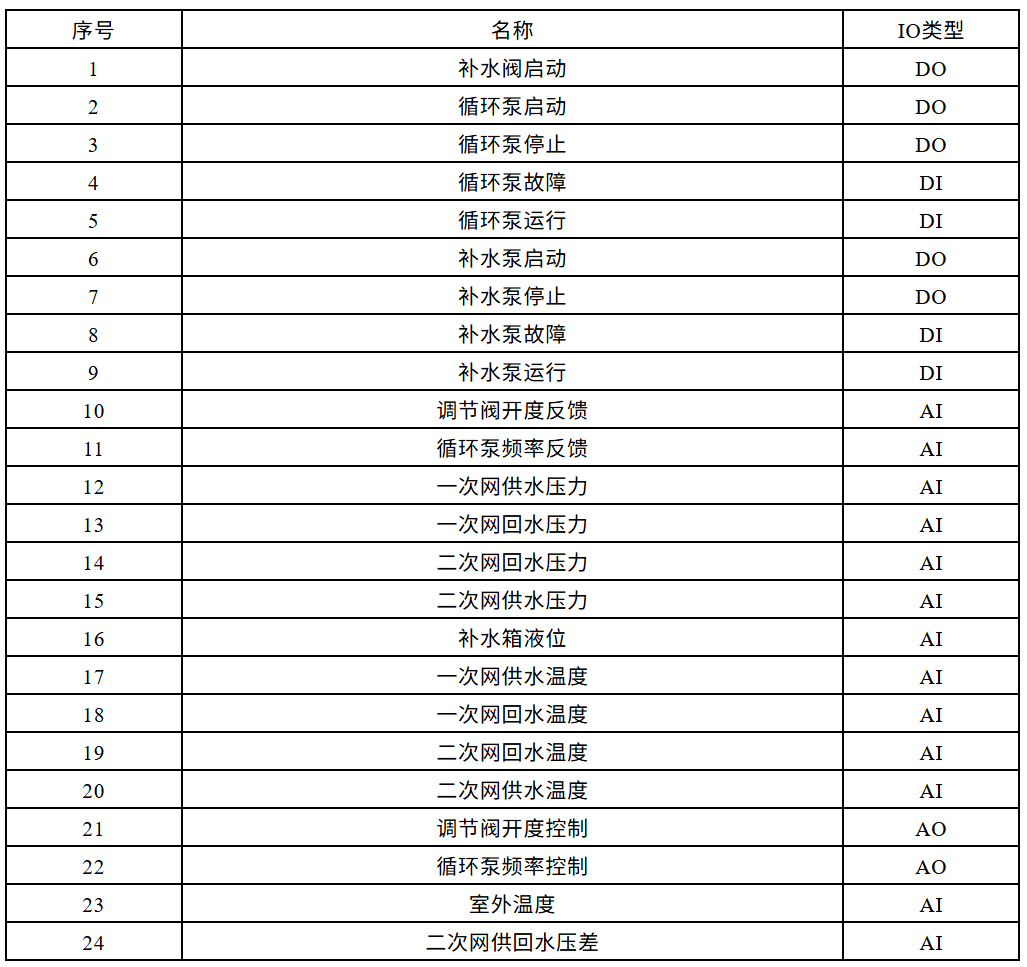 换热站的控制设备及IO测点清单如下所示: