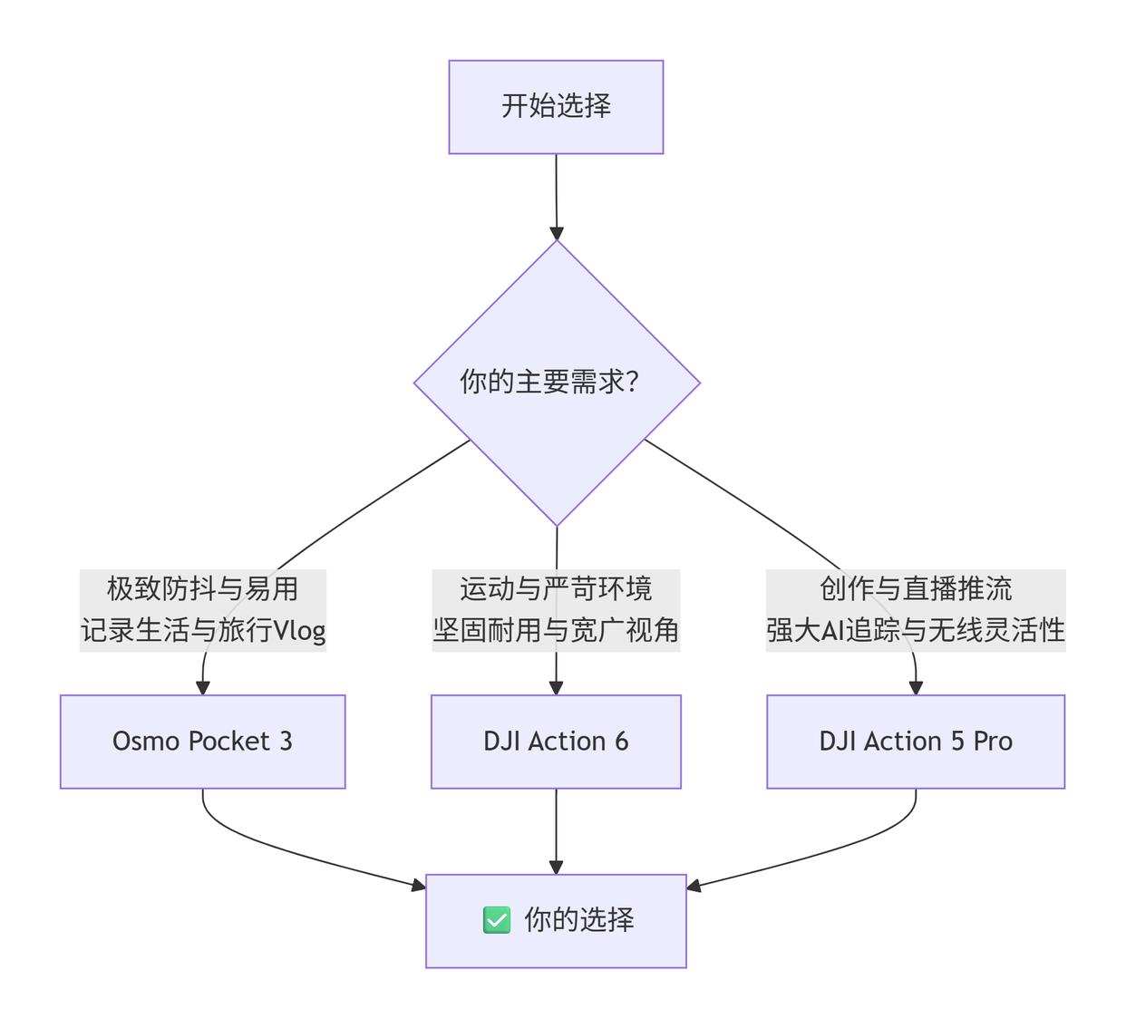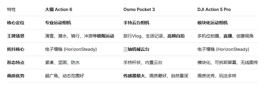 !大疆 Action 6、Pocket 3 和 Action 5 Pro 是定位截然不同的三款产品,选择的关键在于明确你的主要拍摄场景和核心需求。