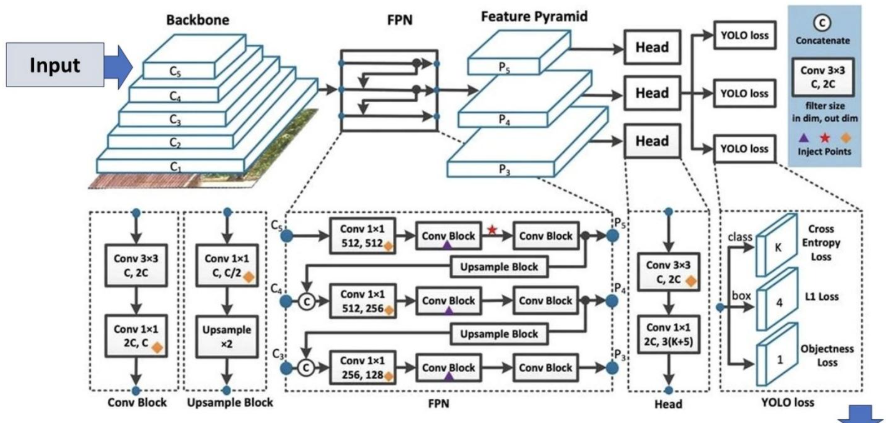 YOLOv3 (2018): YOLOv3是该系列中一个里程碑式的版本,其影响力延续至今。它借鉴了特征金字塔网络(FPN)的思想,实现了多尺度预测 ,通过在三个不同尺寸的特征图上进行检测,极大地改善了对小目标的检测能力。其骨干网络升级为更深、更强大的Darknet-53。