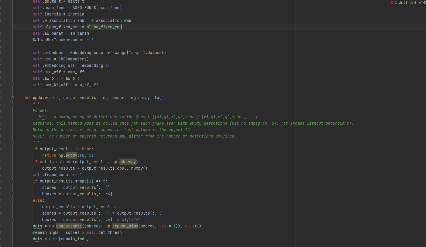 | Adaptive Weighting (AW) | 根据检测质量(置信度、遮挡程度)动态调节 运动相似度 与 外观相似度 的加权比例,使高质量帧更依赖外观匹配,低质量帧更依赖运动预测 | |