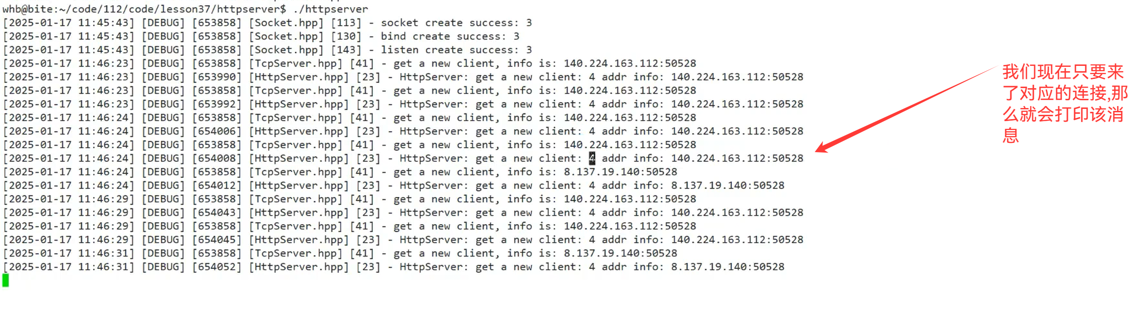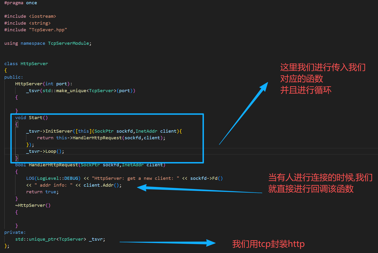 public:HttpServer(int port):_tsvr(std::make_unique<TcpServer>(port)){}void Start(){_tsvr->InitServer([this](SockPtr sockfd,InetAddr client){return this->HandlerHttpRequest(sockfd,client);});_tsvr->Loop();}bool HandlerHttpRequest(SockPtr sockfd,InetAddr client){LOG(LogLevel::DEBUG) << "HttpServer: get a new client: " << sockfd->Fd() << " addr info: " << client.Addr();return true;}~HttpServer(){}