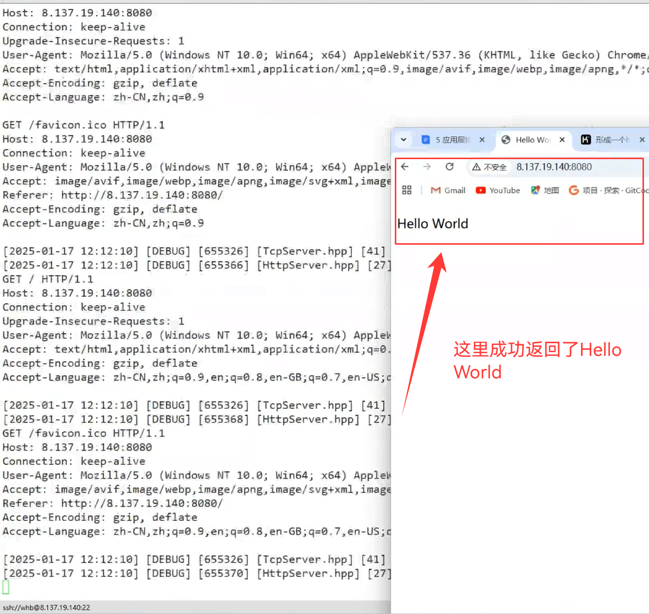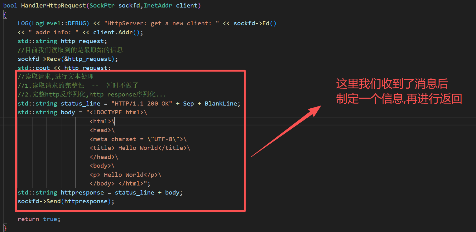 bool HandlerHttpRequest(SockPtr sockfd,InetAddr client){LOG(LogLevel::DEBUG) << "HttpServer: get a new client: " << sockfd->Fd() << " addr info: " << client.Addr();std::string http_request;//目前我们读取到的是最原始的信息sockfd->Recv(&http_request);std::cout << http_request;//读取请求,进行文本处理//1.读取请求的完整性 -- 暂时不做了//2.完整http反序列化,http response序列化...std::string status_line = "HTTP/1.1 200 OK" + Sep + BlankLine;std::string body = "<!DOCTYPE html>\<html>\<head>\<meta charset = \"UTF-8\">\<title> Hello World</title>\</head>\<body>\<p> Hello World</p>\</body> </html>";std::string httpresponse = status_line + body;sockfd->Send(httpresponse);return true;}