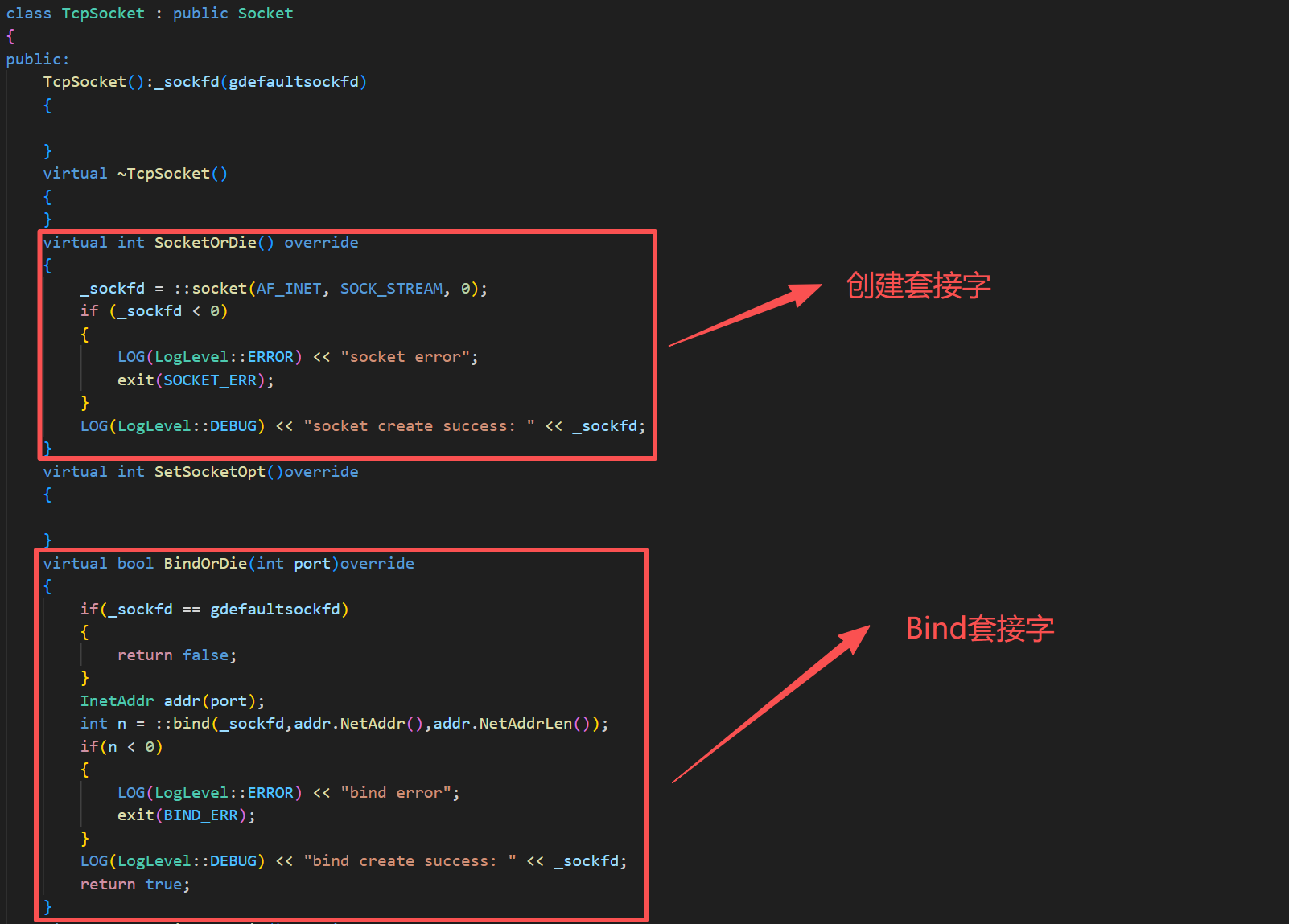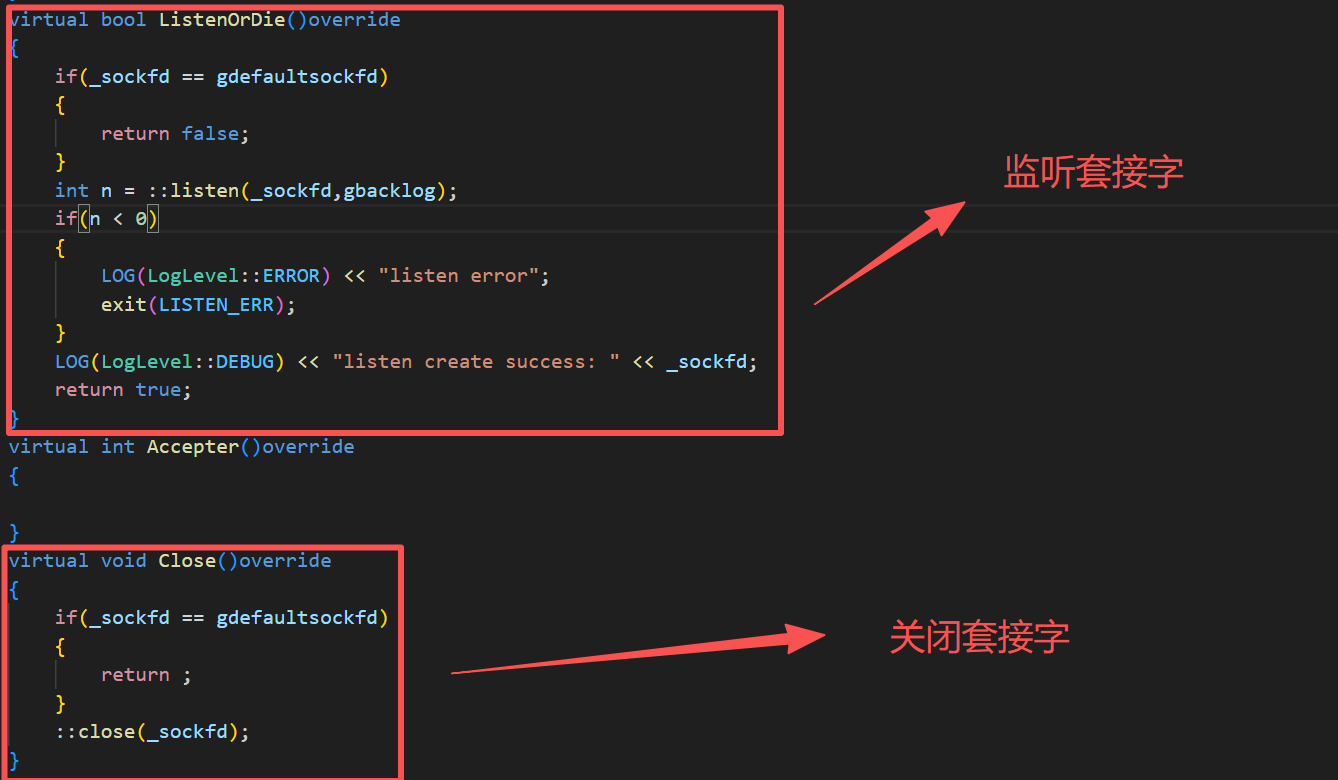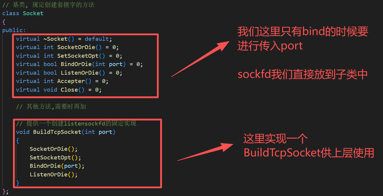 public:virtual ~Socket() = default;virtual int SocketOrDie() = 0;virtual int SetSocketOpt() = 0;virtual bool BindOrDie(int listenscokfd) = 0;virtual bool ListenOrDie(int listenscokfd) = 0;virtual int Accepter(int listenscokfd) = 0;virtual void Close(int fd) = 0;//其他方法,需要时再加//提供一个创建listensockfd的固定实现void BuildTcpSocket(){SocketOrDie();SetSocketOpt();BindOrDie();ListenOrDie();}};class TcpSocket : public Socket