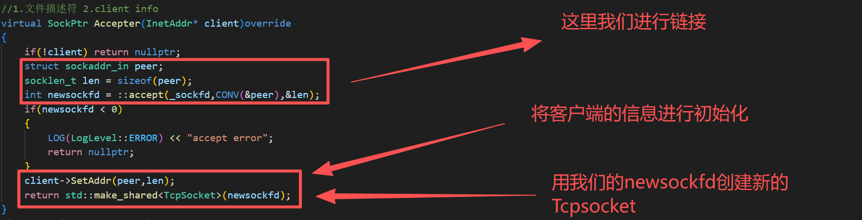 {using namespace LogModule;// 模板方法模式using SockPtr = std::shared_ptr<Socket>;// 基类, 规定创建套接字的方法class Socket{public:virtual ~Socket() = default;virtual int SocketOrDie() = 0;virtual int SetSocketOpt() = 0;virtual bool BindOrDie(int port) = 0;virtual bool ListenOrDie() = 0;virtual SockPtr Accepter(InetAddr* client) = 0;virtual void Close() = 0;// 其他方法,需要时再加// 提供一个创建listensockfd的固定实现void BuildTcpSocket(int port){SocketOrDie();SetSocketOpt();BindOrDie(port);ListenOrDie();}};class TcpSocket : public Socket{public:TcpSocket():_sockfd(gdefaultsockfd){}TcpSocket(int sockfd):_sockfd(sockfd){}virtual ~TcpSocket(){}virtual int SocketOrDie() override{_sockfd = ::socket(AF_INET, SOCK_STREAM, 0);if (_sockfd < 0){LOG(LogLevel::ERROR) << "socket error";exit(SOCKET_ERR);}LOG(LogLevel::DEBUG) << "socket create success: " << _sockfd;}virtual int SetSocketOpt()override{}virtual bool BindOrDie(int port)override{if(_sockfd == gdefaultsockfd){return false;}InetAddr addr(port);int n = ::bind(_sockfd,addr.NetAddr(),addr.NetAddrLen());if(n < 0){LOG(LogLevel::ERROR) << "bind error";exit(BIND_ERR);}LOG(LogLevel::DEBUG) << "bind create success: " << _sockfd;return true;}virtual bool ListenOrDie()override{if(_sockfd == gdefaultsockfd){return false;}int n = ::listen(_sockfd,gbacklog);if(n < 0){LOG(LogLevel::ERROR) << "listen error";exit(LISTEN_ERR);}LOG(LogLevel::DEBUG) << "listen create success: " << _sockfd;return true;}//1.文件描述符 2.client infovirtual SockPtr Accepter(InetAddr* client)override{if(!client) return nullptr;struct sockaddr_in peer;socklen_t len = sizeof(peer);int newsockfd = ::accept(_sockfd,CONV(&peer),&len);if(newsockfd < 0){LOG(LogLevel::ERROR) << "accept error";return nullptr;}client->SetAddr(peer,len);return std::make_shared<TcpSocket>(newsockfd);}virtual void Close()override{if(_sockfd == gdefaultsockfd){return ;}::close(_sockfd);}private:int _sockfd;};//for testint main(){Socket* sk = new TcpSocket();sk->BuildTcpSocket(8080);}